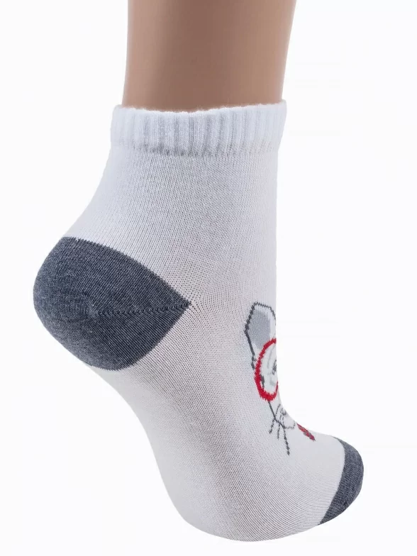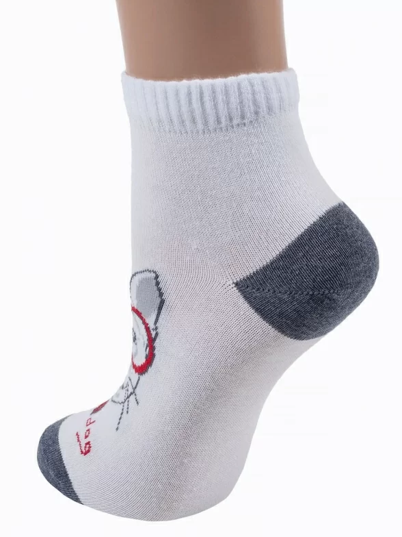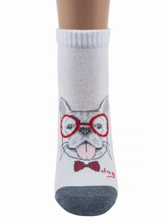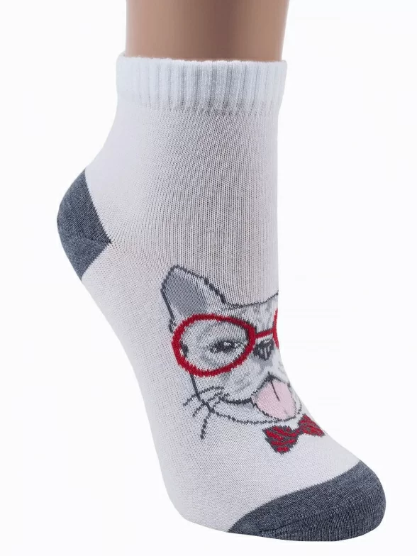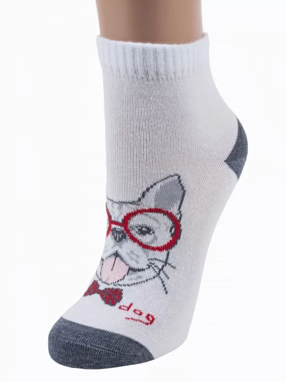 Отличный выбор для любительниц собак! Очаровательные укорчоенные носки с принтом в виде забавного пёсика. Модель также оформлена контрастными элементами. Мягкая резинка модели не создает излишнего давления.