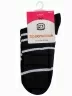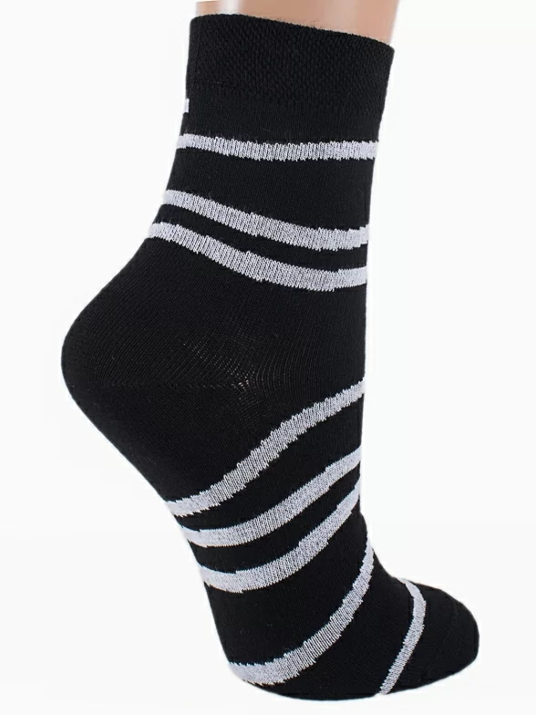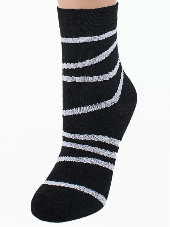 Женские носочки с оригинальным дизайном. Контрастные полосы, как бы опоясывающие ногу, смотрятся очень эффектно на темном фоне. Модель изготовлена из приятного качественного трикотажа с высоким процентом хлопка и отличается удобной резинкой.