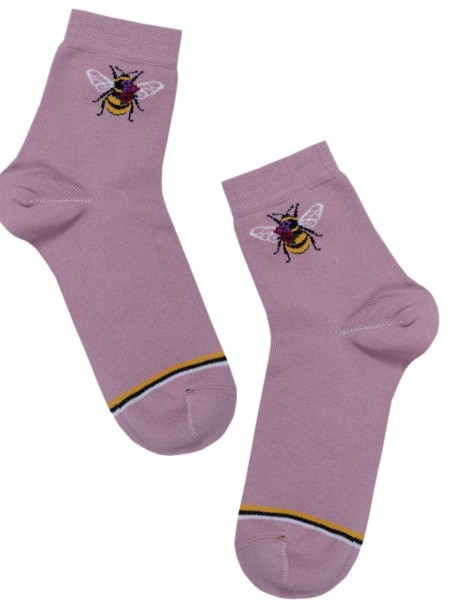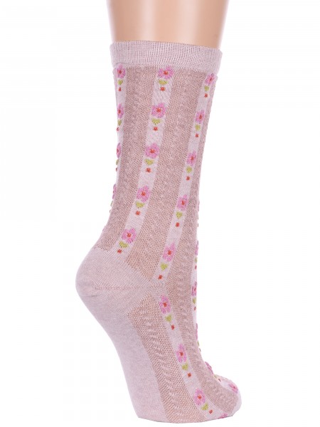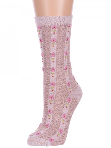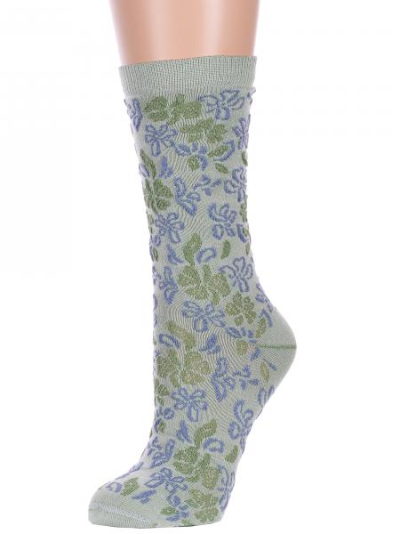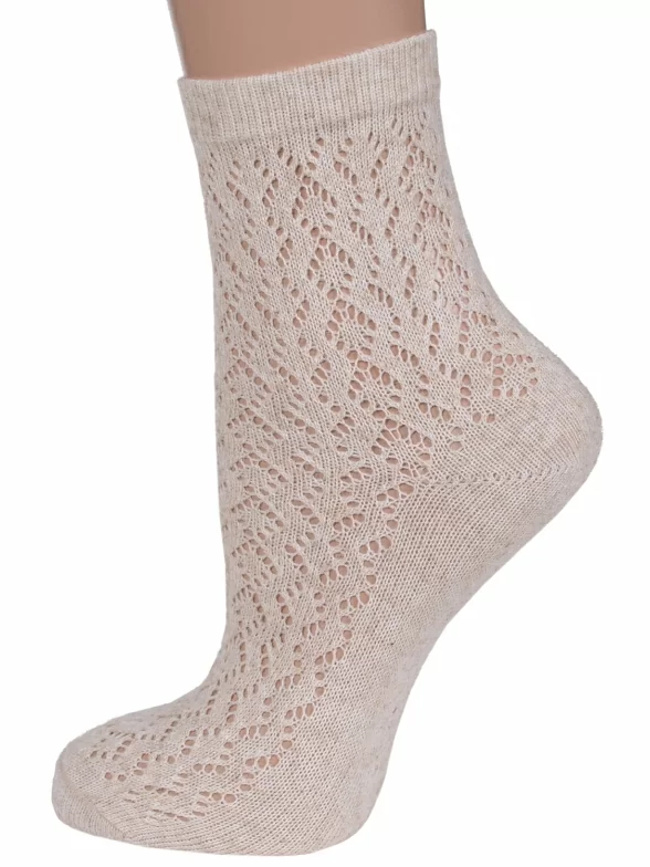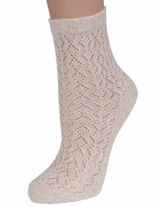 Женские носки связаны двумя типами узоров. Основная часть вывязана ажурным узором, мысок и следок — гладью. Модель сделана из хлопка, полиамида, полиэстера и льна.
