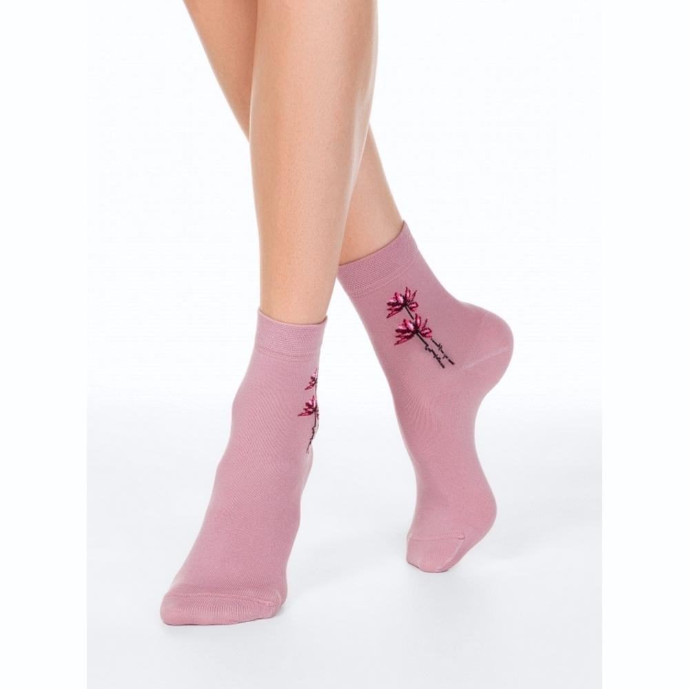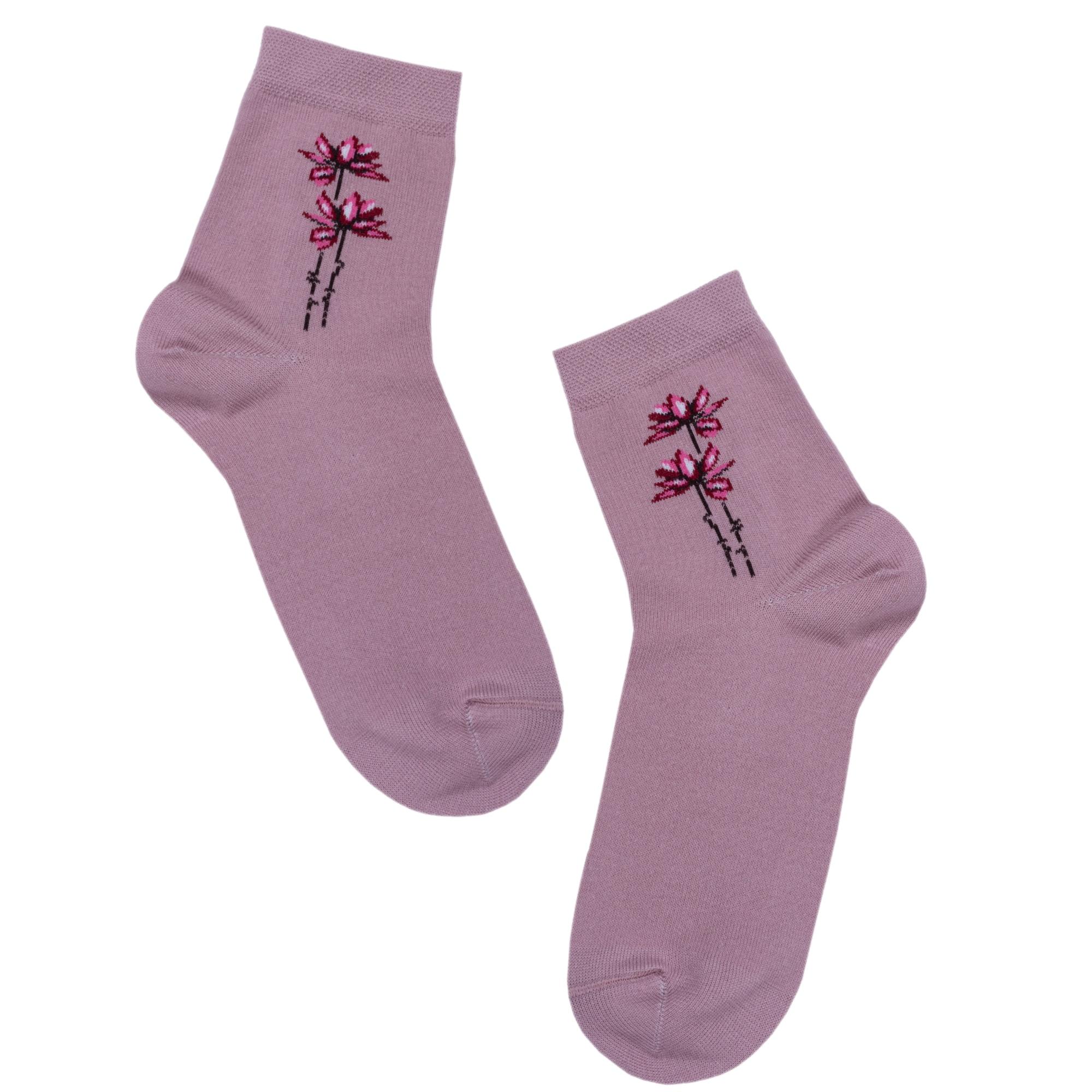 Круглогодичные укороченные женские носки, цвет розовый, повседневные, шов кеттельный (бесшовная технология), принт (рисунок): цветы / растения, с узором, состав: 70% хлопок, 28% полиэстер, 2% эластан, арт. 14С1100. Производитель «Брестский чулочный комбинат ОАО, Беларусь» под брендом «Брестские (бчк)».