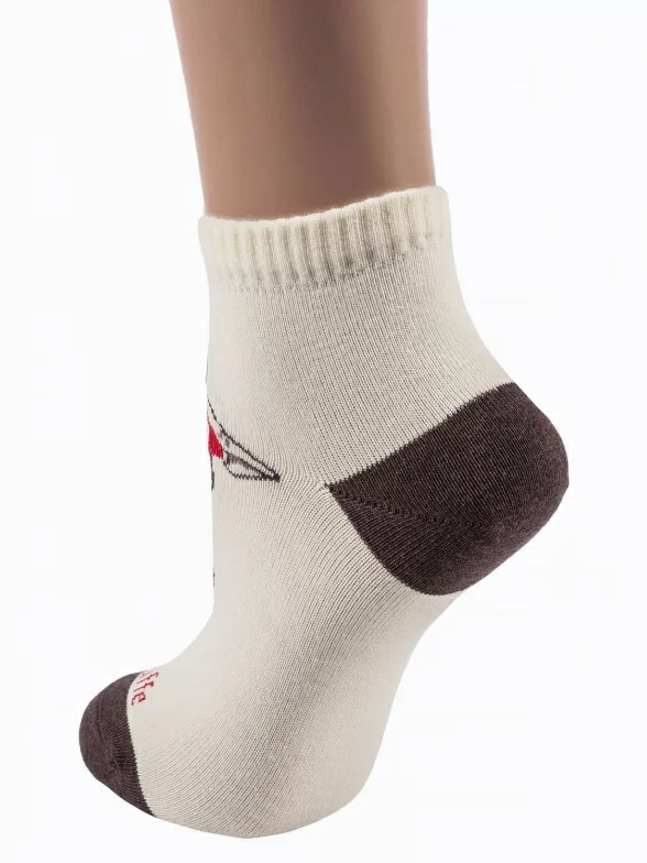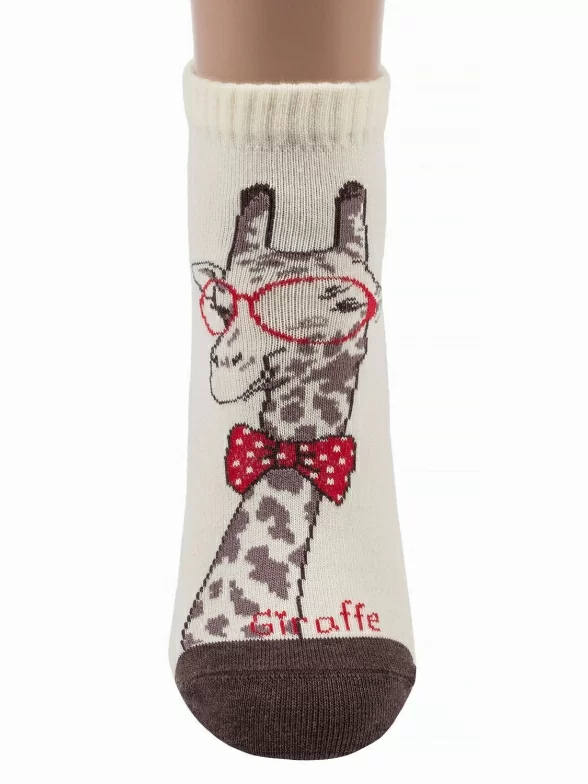 Оригинальные женские носки укороченного фасона. Они отличаются мягкой красиво связанной резинкой и оформлены принтом с жирафом, который подчеркивают однотонные контрастные детали – мысок и пятка.