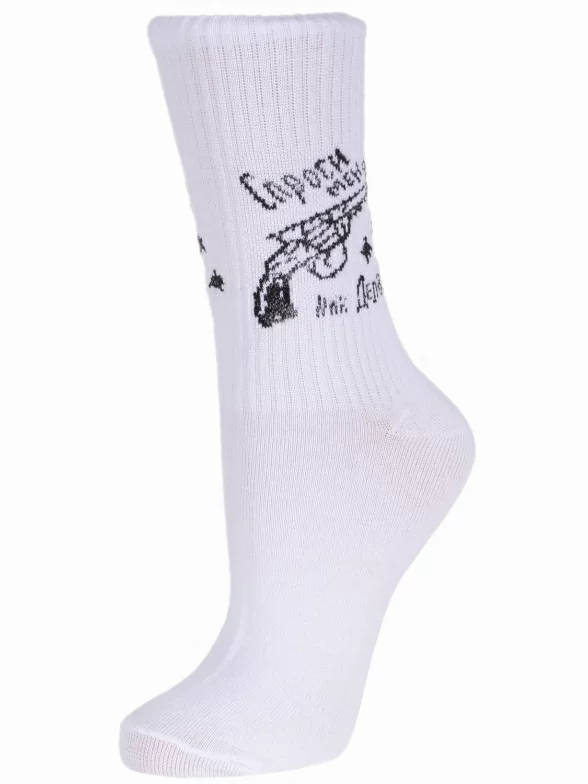 Круглогодичные или летние средней длины женские носки, цвет черный + белый-белый, повседневные, шов обычный (не бесшовные), принт (рисунок): надписи, в рубчик, с узором, крупные контрастные рисунки, состав: 90% хлопок, 7% полиамид, 3% эластан, арт. L34ж. Производитель «ЧЕЛНЫ ТЕКСТИЛЬ» Россия под брендом «Челны текстиль».