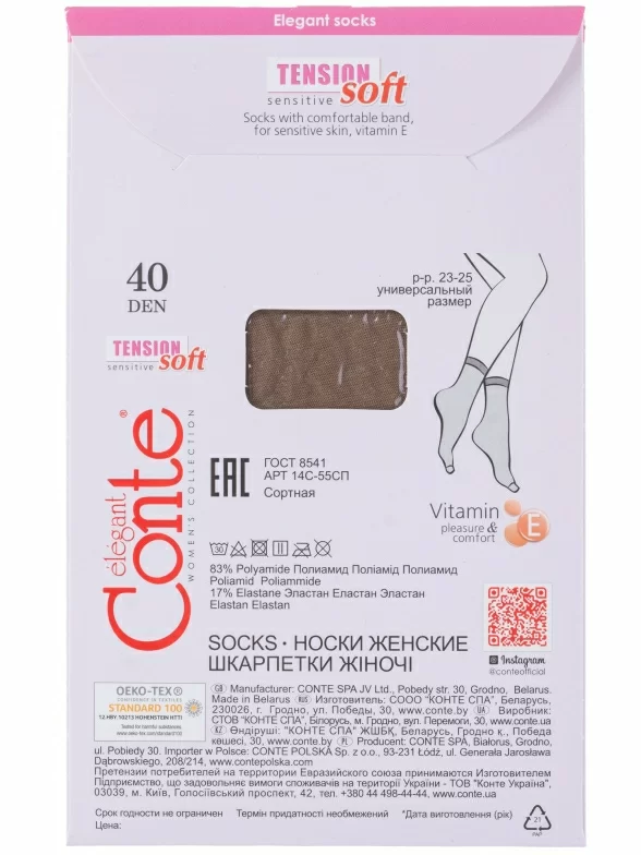 Бренд Conte производится в Беларуси. Носки 14С-55СП/Tension soft 40Н легко стираются при температуре до 40 градусов и быстро сохнут, сохраняя первоначальный вид.