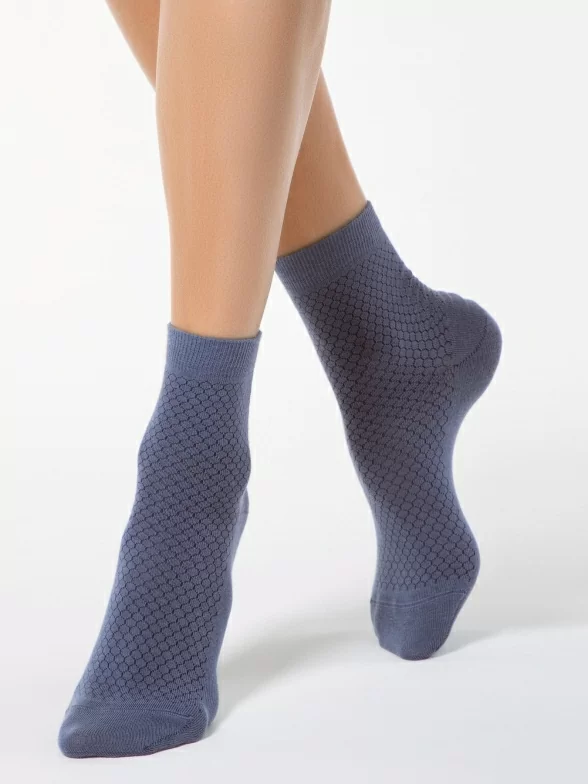 Женские носки от белорусского производителя Conte связаны из хлопка с добавлением полиамида и эластана. Модель, фиксирующаяся широкой резинкой, вывязана принтом в виде сот.