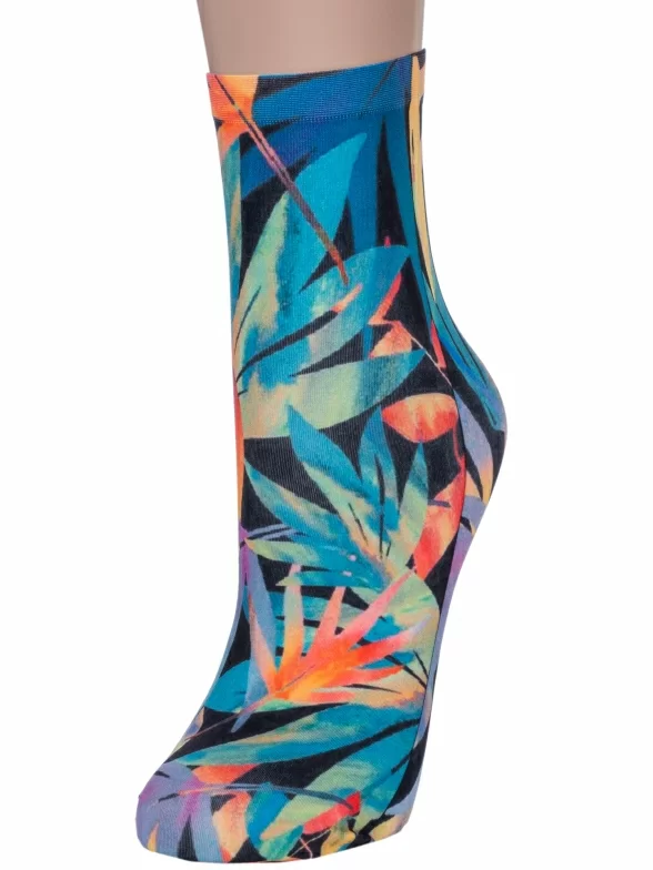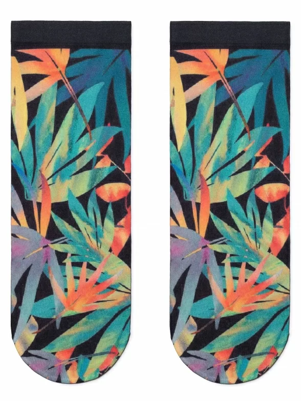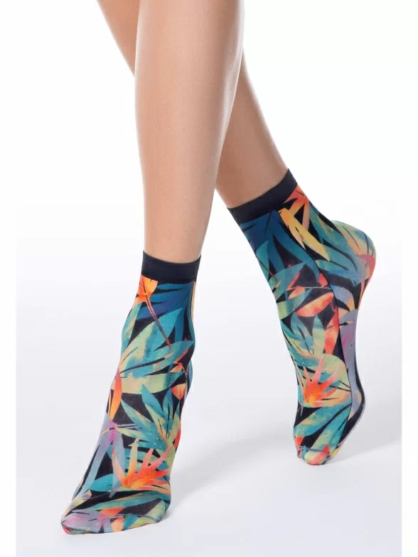 Капроновые фантазийные женские носки плотностью 70 den с тропическим растительным принтом, нанесенным термопечатью.