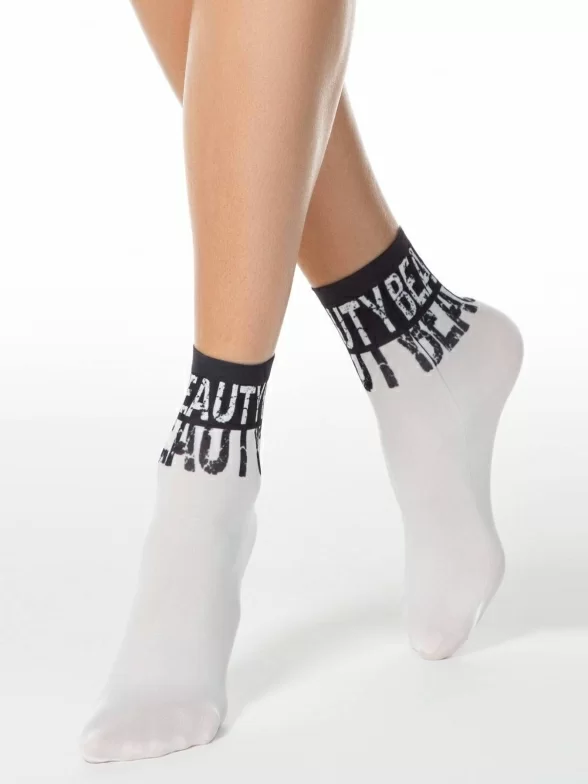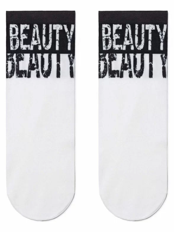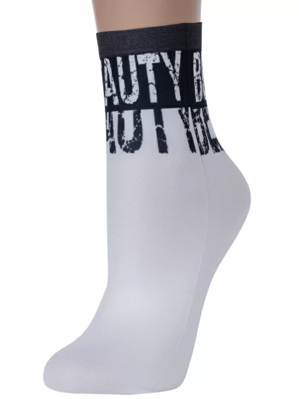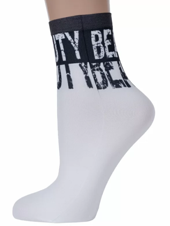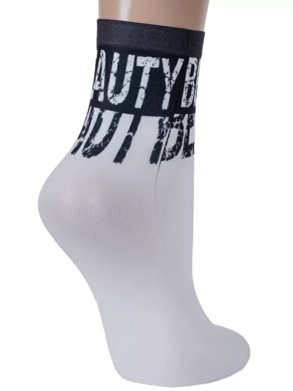 Капроновые фантазийные женские носки плотностью 70 den с принтом в виде надписей "Beauty" (с англ. "Красота"), нанесенных термопечатью.