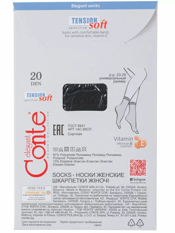 Летние укороченные женские носки, цвет черный, капроновые, классические, шов обычный (не бесшовные), принт (рисунок): однотонный, без рисунков/узоров, состав: 87% полиамид, 13% эластан, арт. 14С-56СП/Tension soft 20Н. Производитель «Conte, Беларусь» под брендом «Conte».