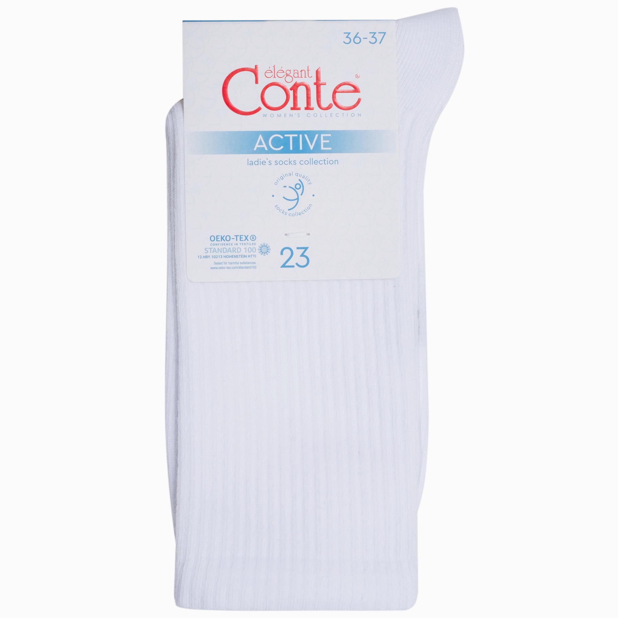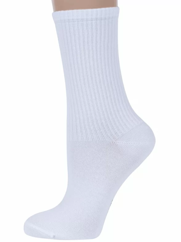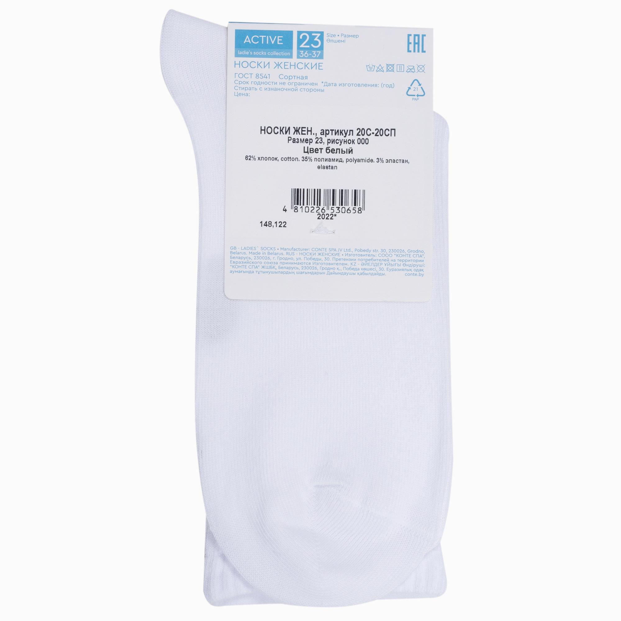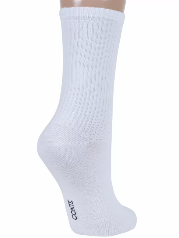 Летние или круглогодичные средней длины женские носки, цвет белый, спортивные, классические, шов кеттельный (бесшовная технология), принт (рисунок): в рубчик, однотонный, состав: 62% хлопок, 35% полиамид, 3% эластан, арт. 20С-20СП. Производитель «Conte, Беларусь» под брендом «Conte».