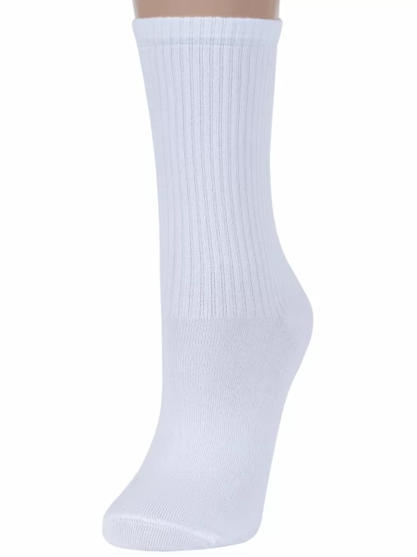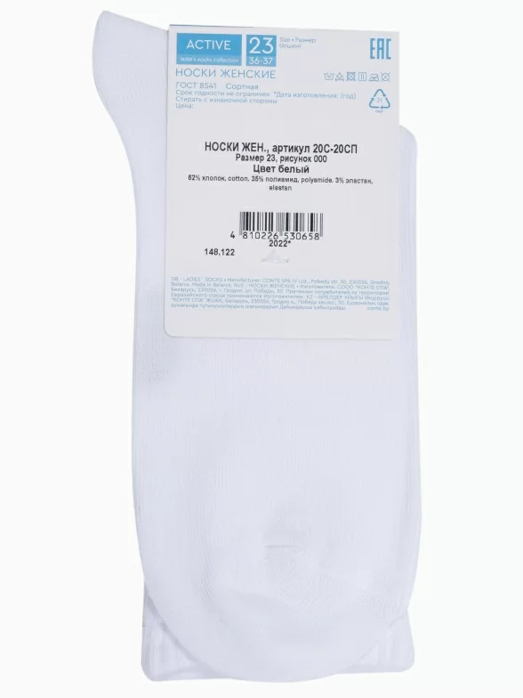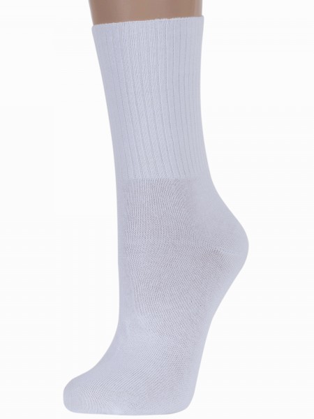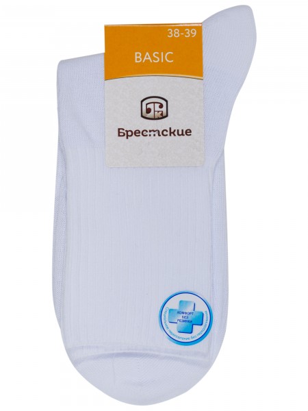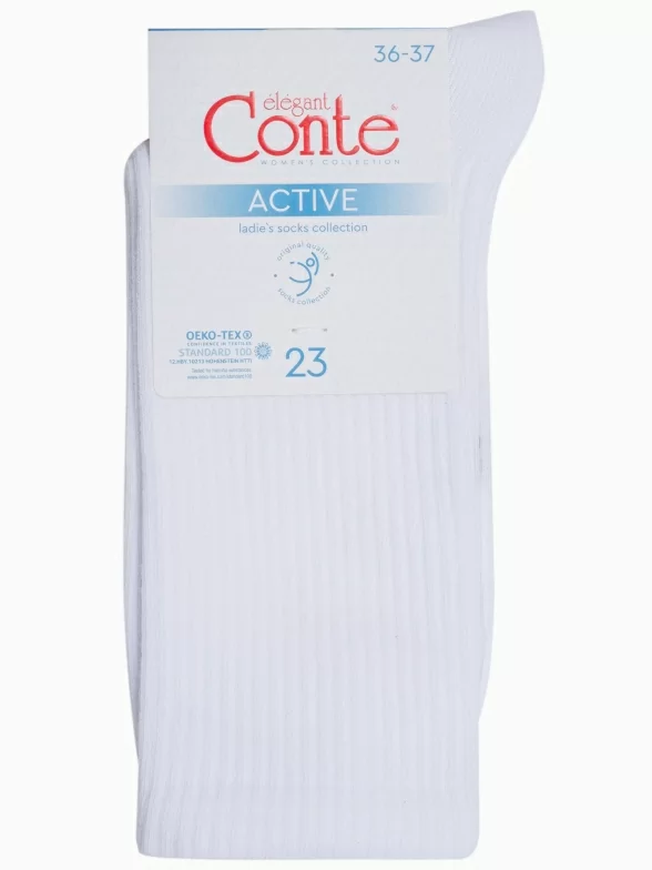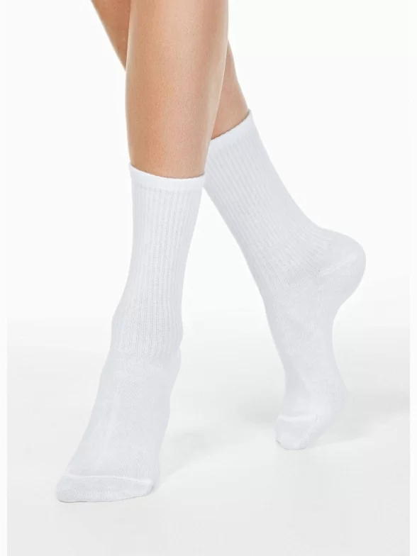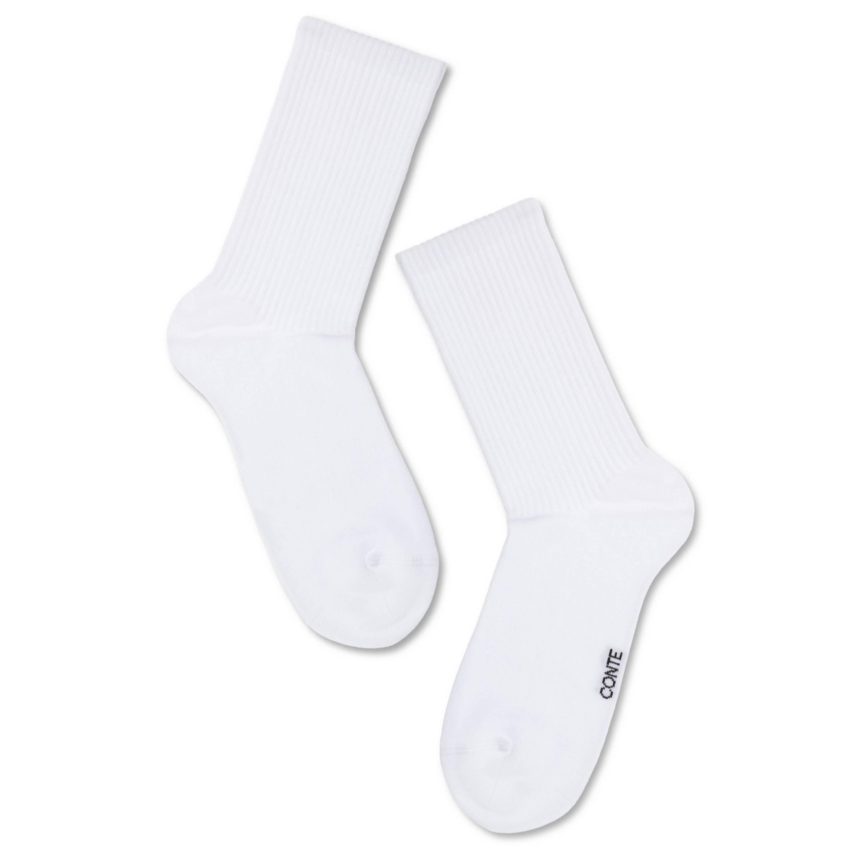 Летние или круглогодичные средней длины женские носки, цвет белый, спортивные, классические, шов кеттельный (бесшовная технология), принт (рисунок): в рубчик, однотонный, состав: 62% хлопок, 35% полиамид, 3% эластан, арт. 20С-20СП. Производитель «Conte, Беларусь» под брендом «Conte».