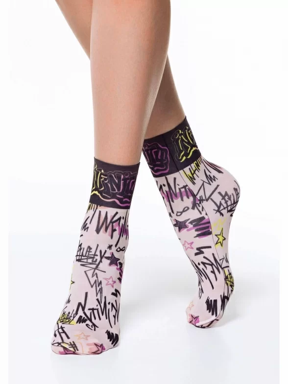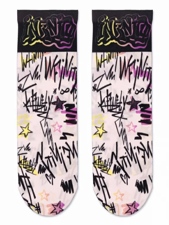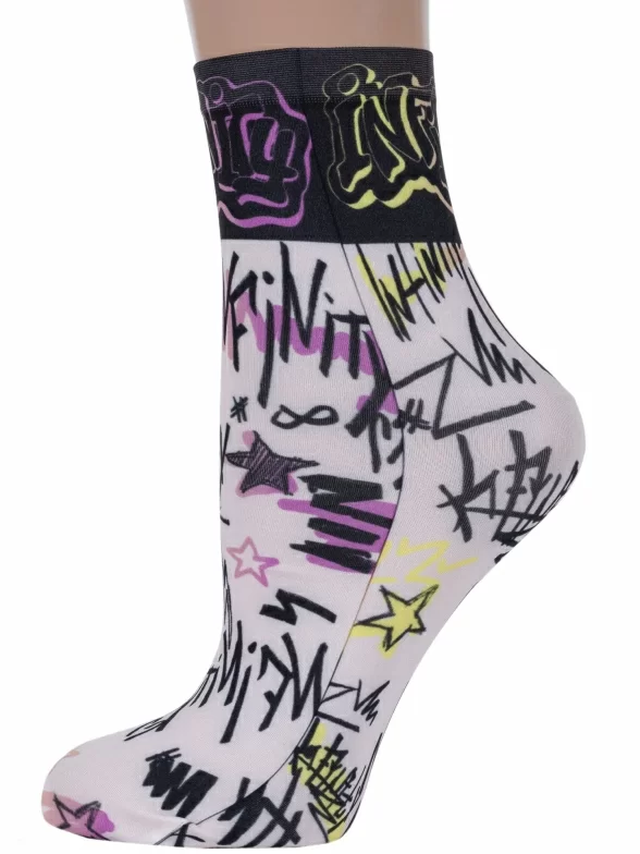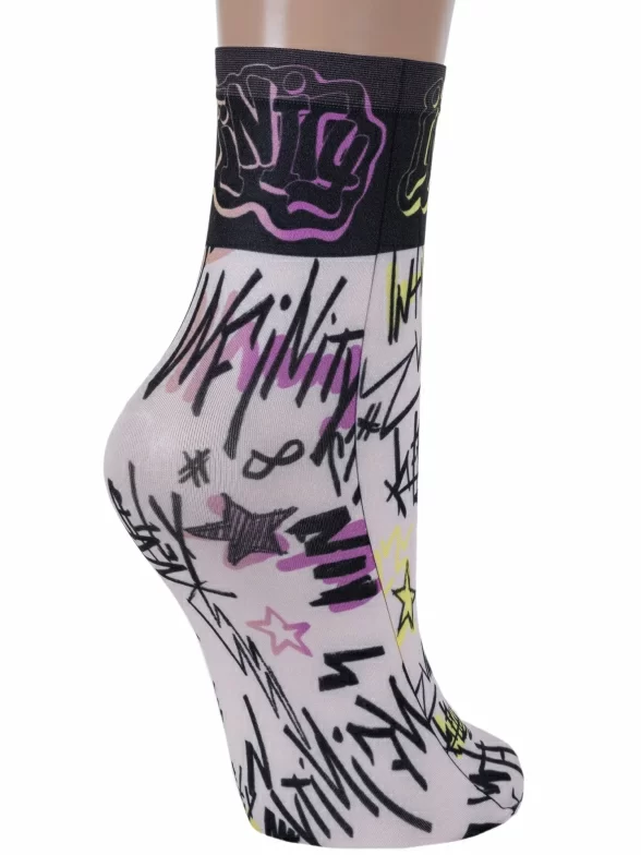 Женские капроновые носки плотностью 70 den с оригинальным принтом в стиле граффити и надписью "Бесконечность" на английском.