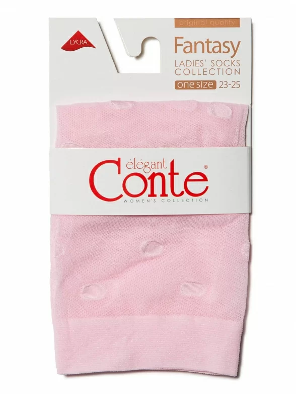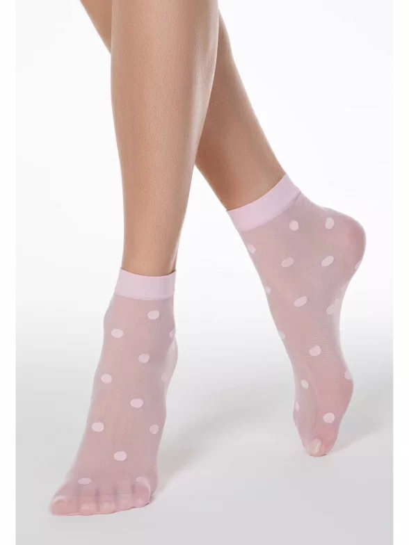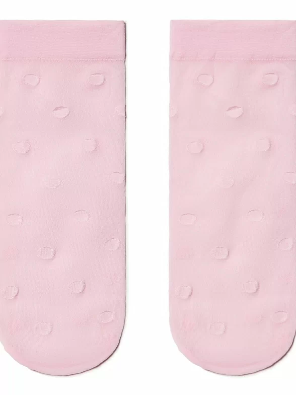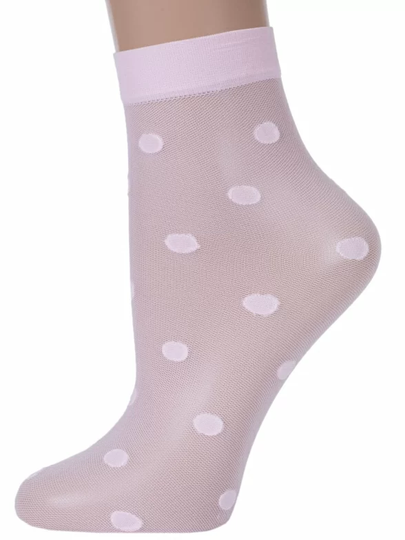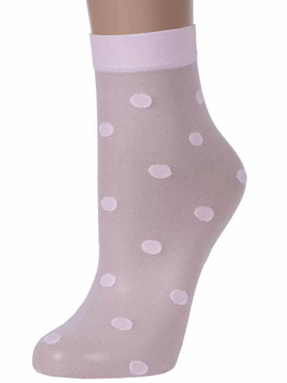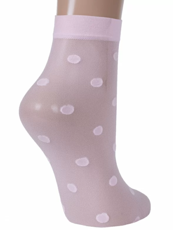 Капроновые тонкие носки с узором в крупный горох подойдут для летней открытой или закрытой обуви. Изготовлены из синтетических нитей на фабрике в Беларуси. Модель укороченной длины плотностью 20 den без отдельной вывязанной пятки с плоским швом на мыске.