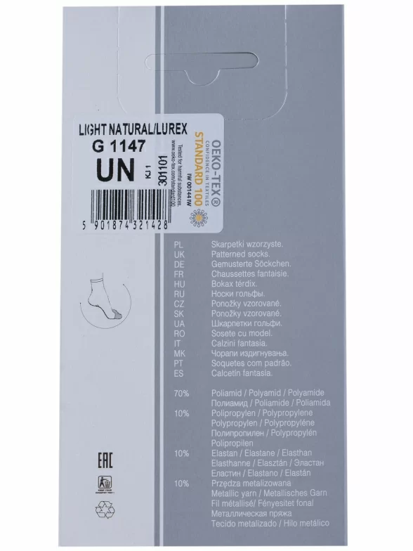 Изготовлены в Польше из гладкого синтетического полотна на основе полиамида с добавлением эластана и полипропилена, за счет чего носки достаточно износостойкие и хорошо тянутся. Процентное соотношение волокон: 70% полиамид, 10% эластан, 10% полипропилен (prolen), 10% люрекс.
