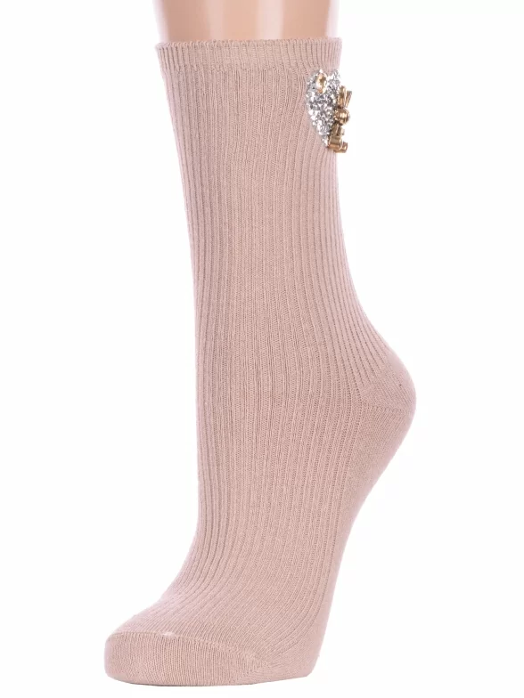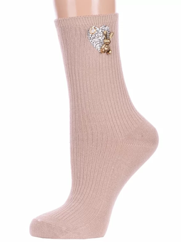 Круглогодичные средней длины женские носки, цвет бежевый, с украшениями, необычные, шов обычный (не бесшовные), принт (рисунок): сердечки / поцелуи / любовь, животные, в рубчик, с узором, состав: 75% хлопок, 23% полиамид, 2% эластан, арт. Нжвип1000-03. Производитель «Китай, страна бренда - Россия» под брендом «Hobby line».