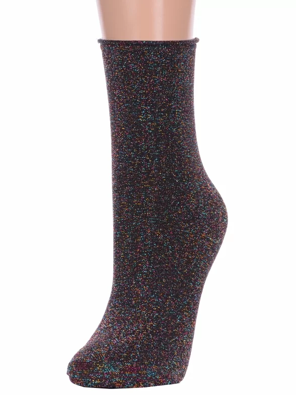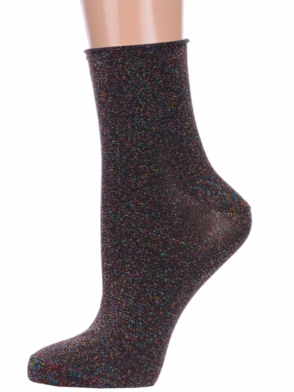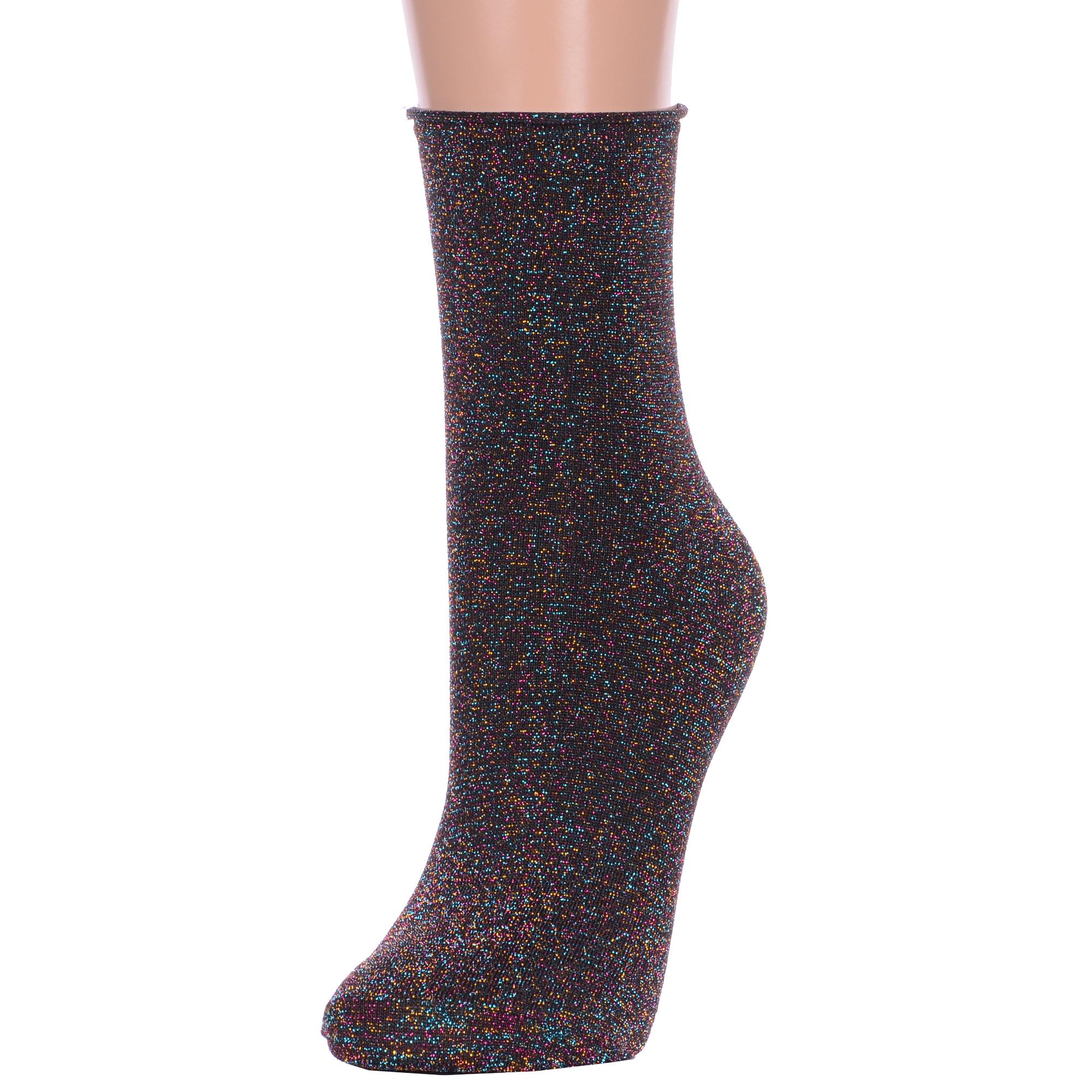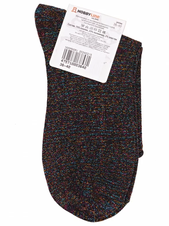 Круглогодичные укороченные женские носки, цвет черный, классические, шов обычный (не бесшовные), принт (рисунок): блеск люрекса, однотонный, без рисунков/узоров, состав: 75% хлопок, 23% полиамид, 2% эластан, арт. Нжл2115. Производитель «Китай, страна бренда - Россия» под брендом «Hobby line».