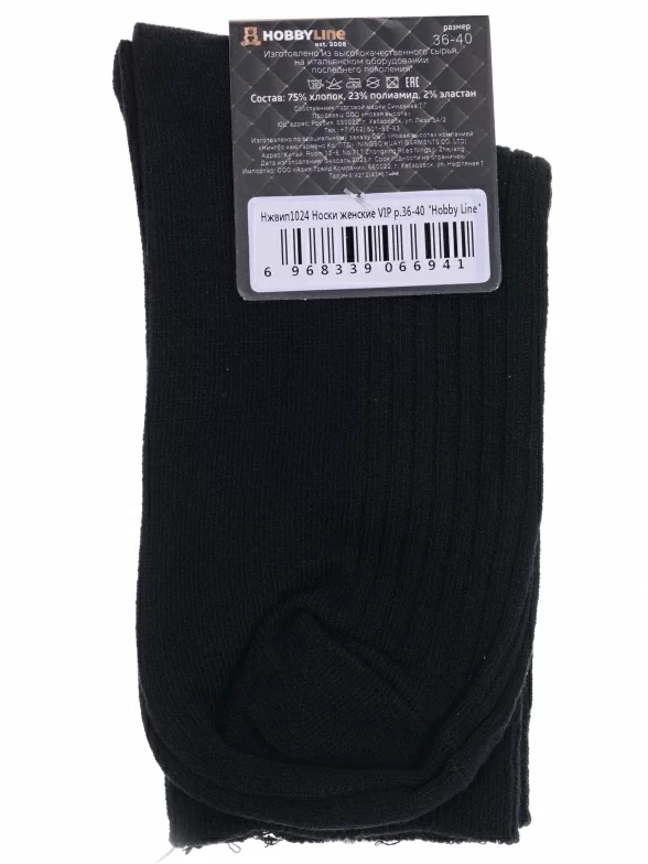 Круглогодичные средней длины женские носки, цвет черный, необычные, шов обычный (не бесшовные), принт (рисунок): в рубчик, однотонный, без рисунков/узоров, состав: 75% хлопок, 23% полиамид, 2% эластан, арт. Нжвип1024. Производитель «Китай, страна бренда - Россия» под брендом «Hobby line».