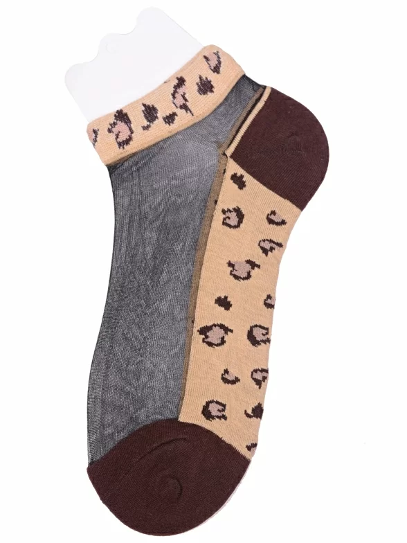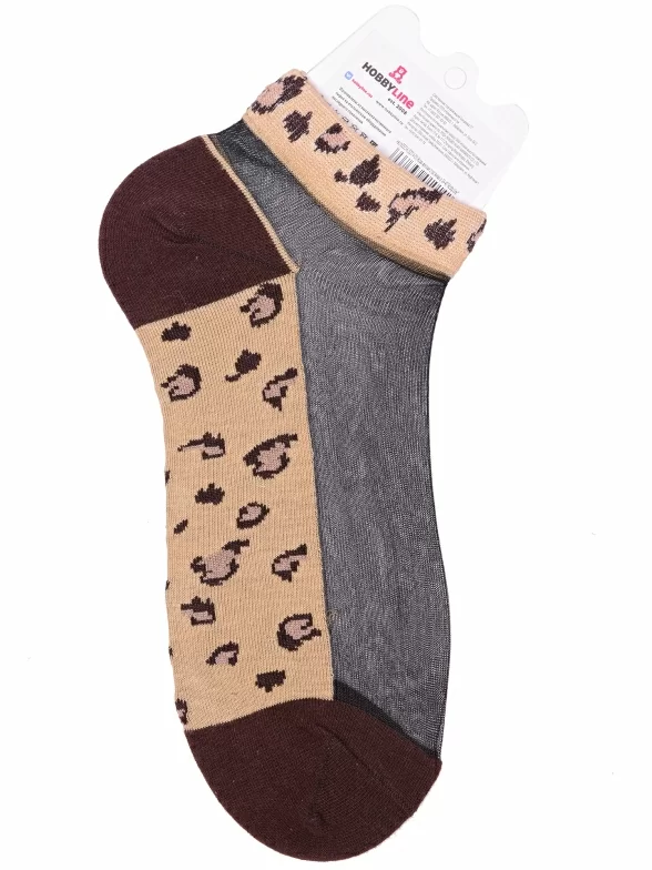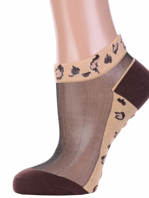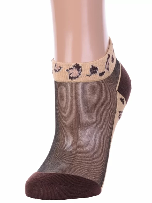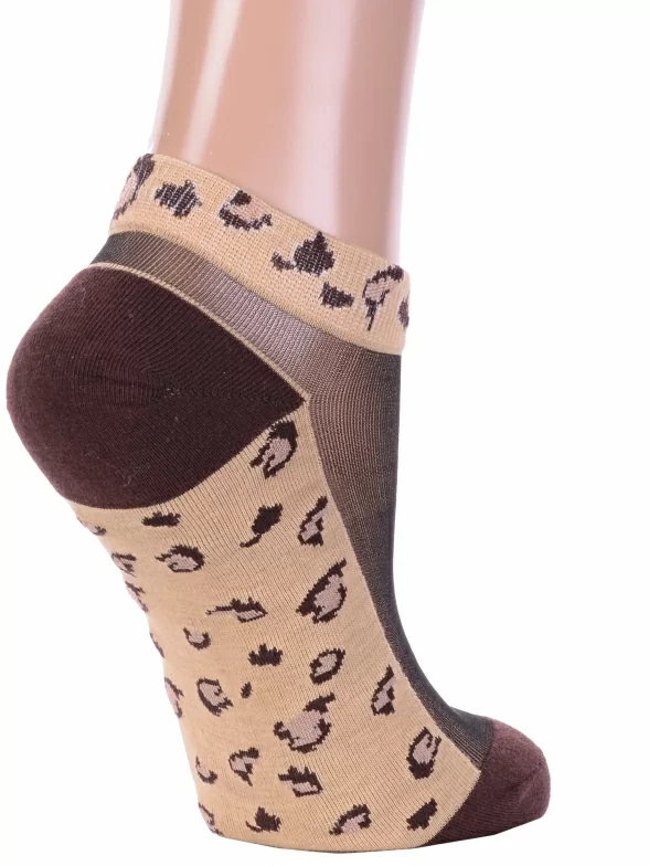 Межсезонные или летние короткие женские носки, цвет коричневый, повседневные, капроновые, возможно бесшовные, принт (рисунок): леопардовый, контрастные пятка / мысок / резинка, с узором, состав: 30% хлопок, 60% нейлон, 10% эластан, арт. Нжсту2563-6. Производитель «Китай, страна бренда - Россия» под брендом «Hobby line».