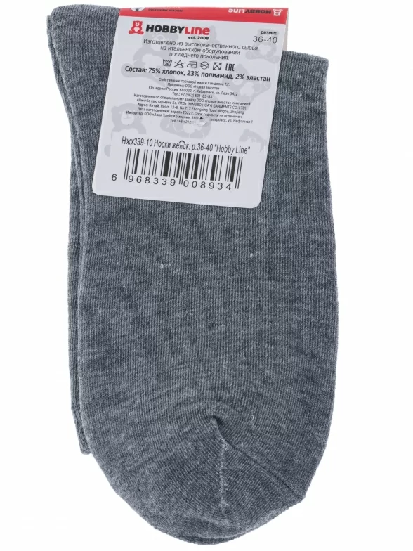 Круглогодичные укороченные женские носки, цвет серый, классические, шов обычный (не бесшовные), принт (рисунок): однотонный, без рисунков/узоров, состав: 75% хлопок, 23% полиамид, 2% эластан, арт. 339. Производитель «Китай, страна бренда - Россия» под брендом «Hobby line».