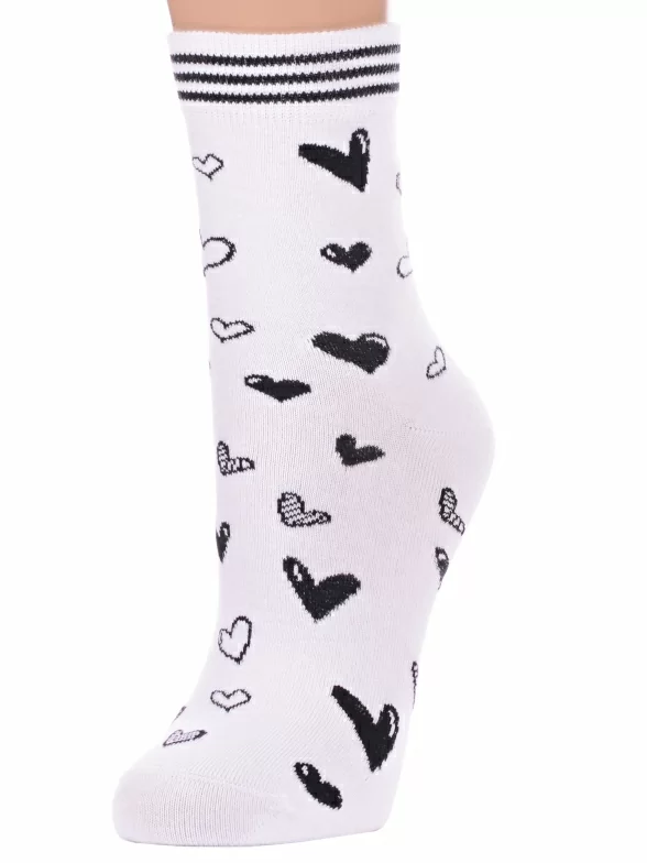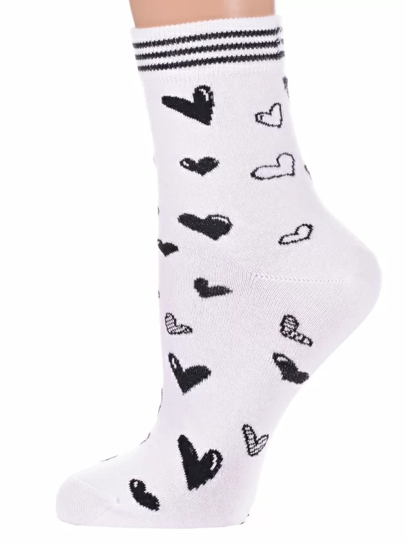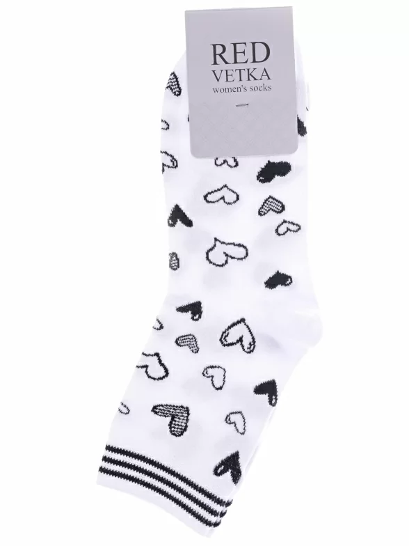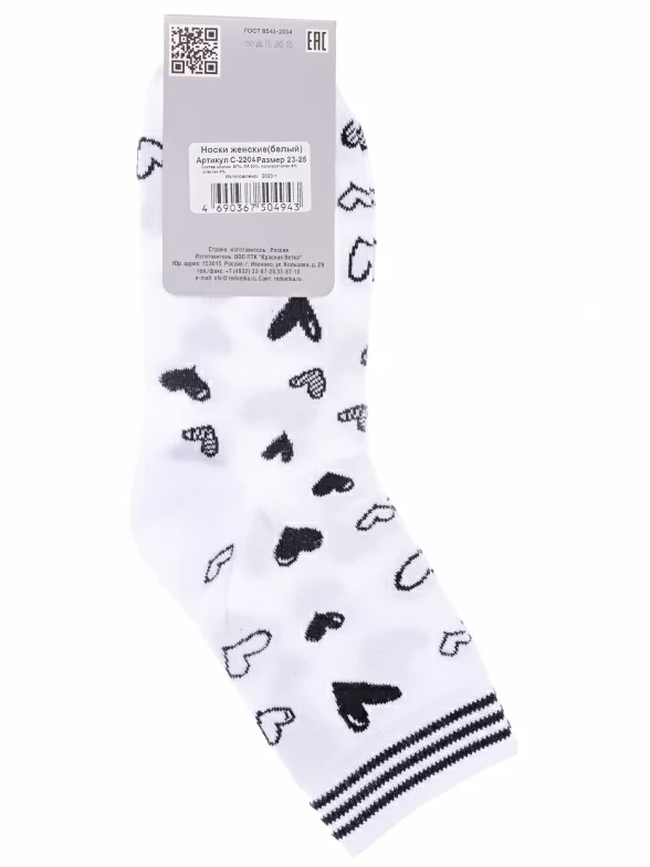 Круглогодичные укороченные женские носки, цвет белый, повседневные, возможно бесшовные, принт (рисунок): сердечки / поцелуи / любовь, с узором, состав: 67% хлопок, 20% полиамид, 9% полипропилен, 4% эластан, арт. С-2204. Производитель «КРАСНАЯ ВЕТКА» Россия под брендом «Красная ветка».