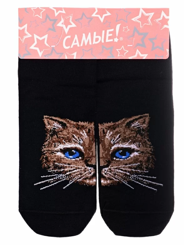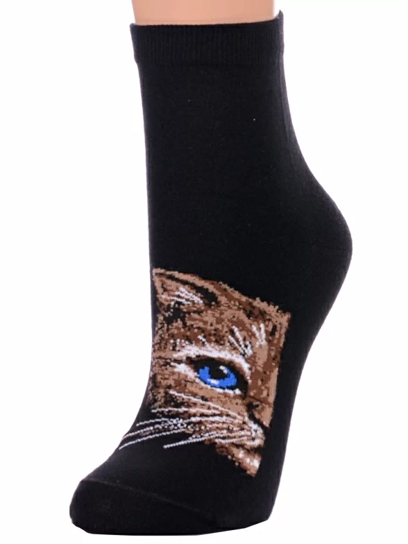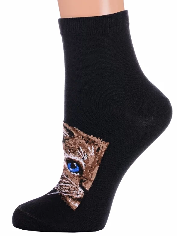 Круглогодичные укороченные женские носки, цвет черный, повседневные, возможно бесшовные, принт (рисунок): животные, с узором, крупные контрастные рисунки, состав: 72% хлопок, 23% полиамид, 5% эластан (узор из полипропилена), арт. С-1438. Производитель «КРАСНАЯ ВЕТКА» Россия под брендом «Красная ветка».