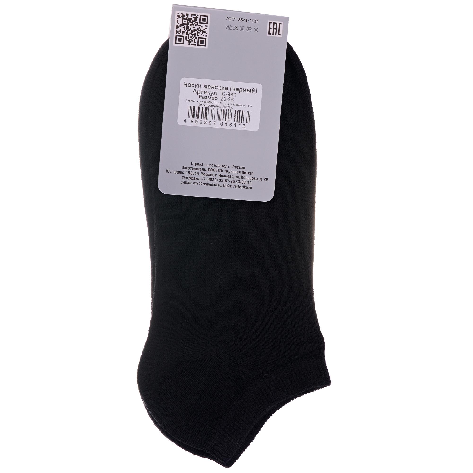 Межсезонные или летние короткие женские носки, цвет черный, классические, возможно бесшовные, принт (рисунок): однотонный, без рисунков/узоров, состав: 53% хлопок, 27% полиэстер, 15% полиамид, 5% эластан, арт. С-961. Производитель «КРАСНАЯ ВЕТКА» Россия под брендом «Красная ветка».