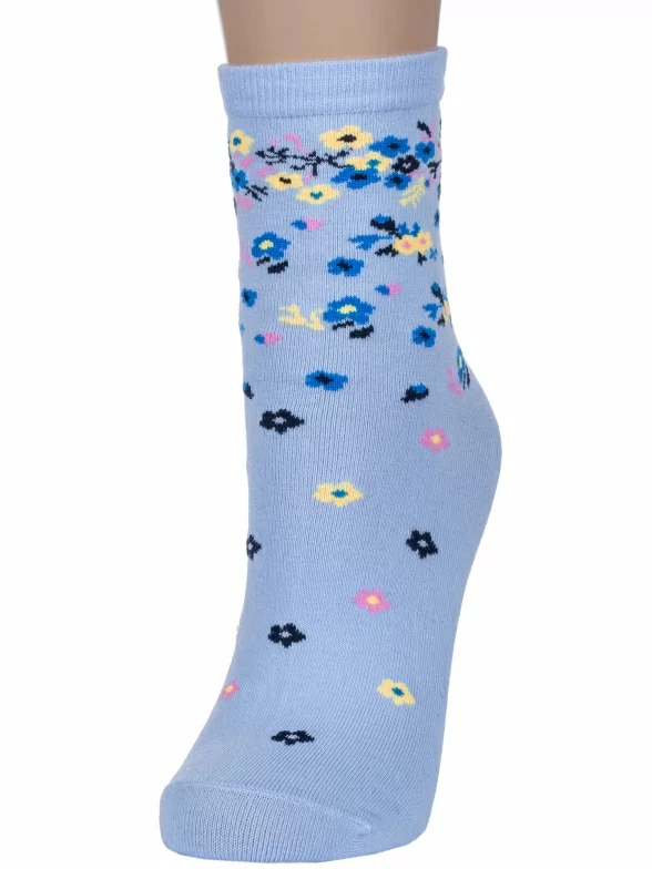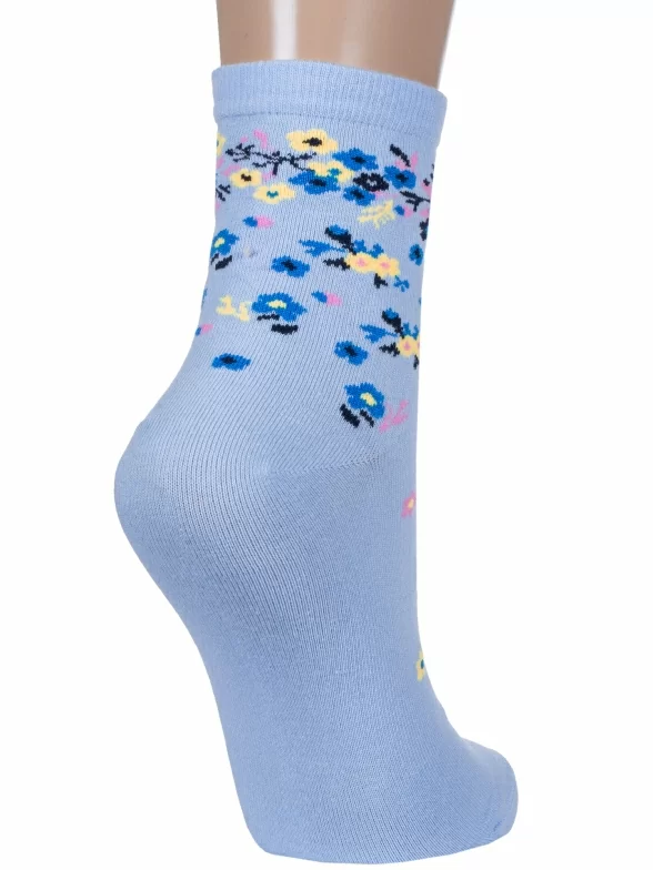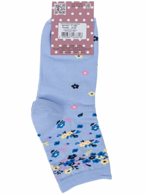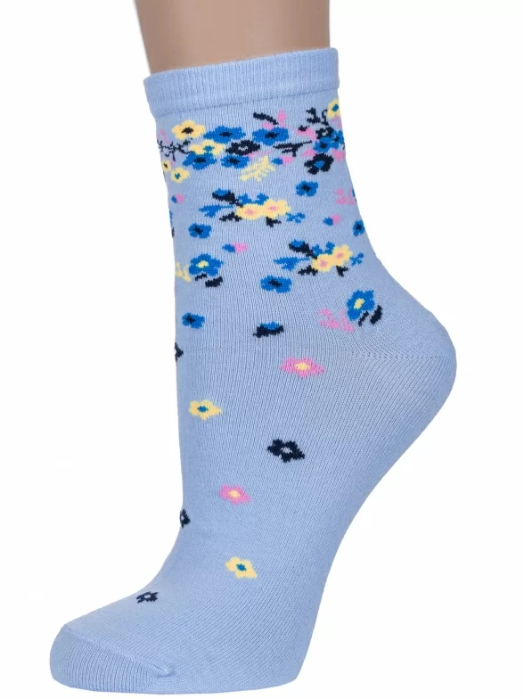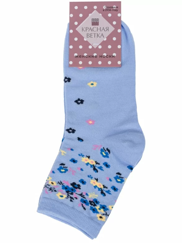 Круглогодичные укороченные женские носки, цвет голубой, повседневные, возможно бесшовные, принт (рисунок): цветы / растения, с узором, состав: 64% хлопок, 20% полиамид, 12% полипропилен, 4% эластан, арт. С-1255. Производитель «КРАСНАЯ ВЕТКА» Россия под брендом «Красная ветка».