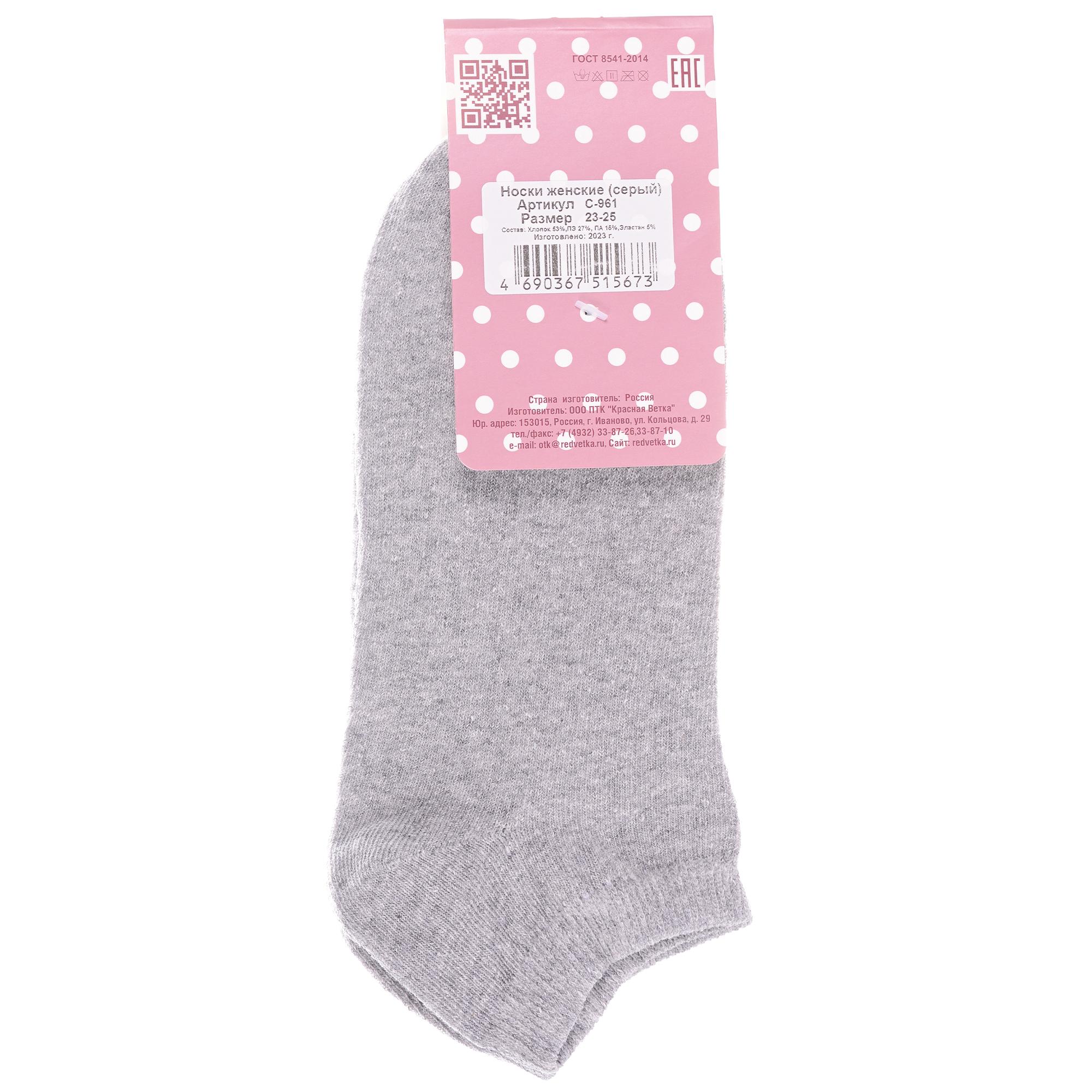 Межсезонные или летние короткие женские носки, цвет серый, классические, возможно бесшовные, принт (рисунок): однотонный, без рисунков/узоров, состав: 53% хлопок, 27% полиэстер, 15% полиамид, 5% эластан, арт. С-961. Производитель «КРАСНАЯ ВЕТКА» Россия под брендом «Красная ветка».