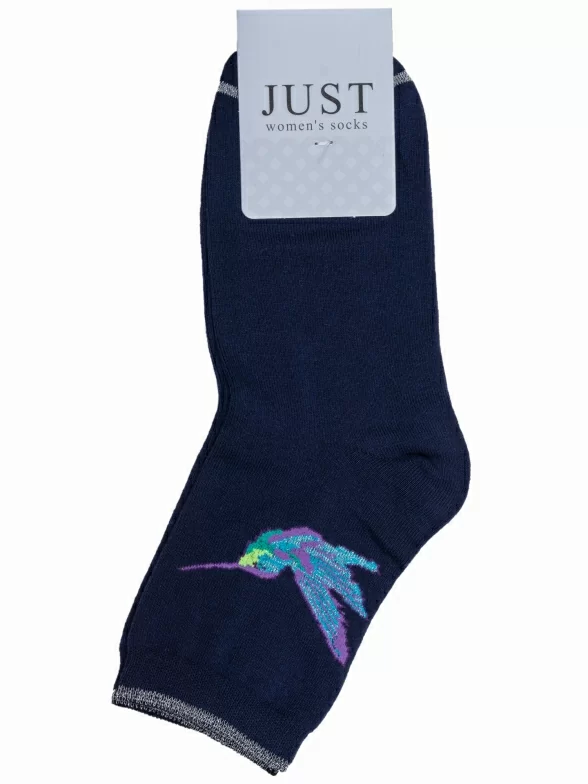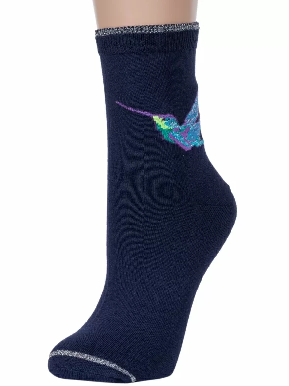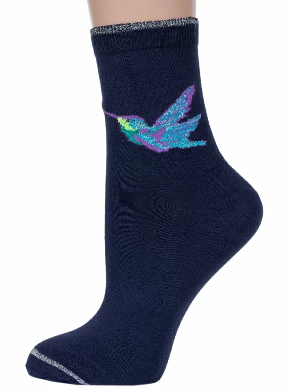 Женские хлопковые носки "Красная ветка". Качественные носки повышенной плотности. Прочные и хорошо тянутся, благодаря входящим в состав полиамиду и эластану, а нить люрекса добавляет блеск изделию. Отлично сочетаются с повседневной одеждой. После многочисленных стирок сохраняют яркость цвета и не скатываются. Модель украшена изображением колибри.