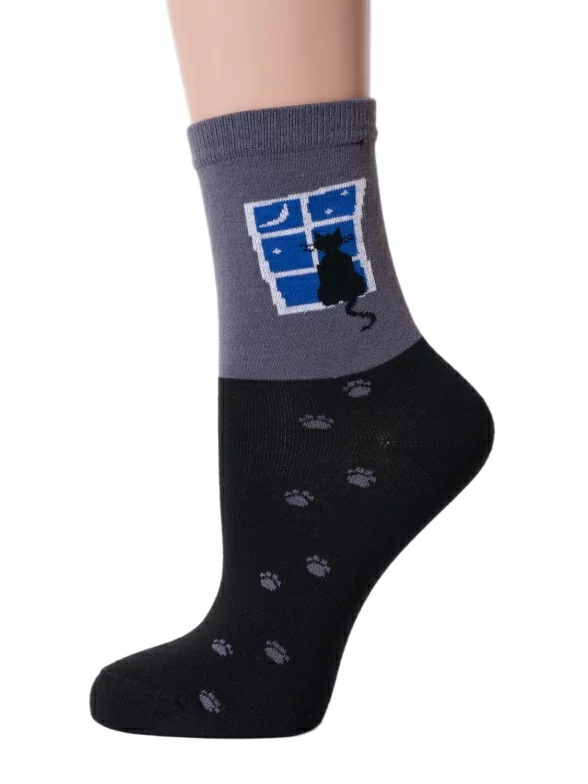 Женские хлопковые носки LORENZLine серого и черного цвета. Особенность модели - забавный принт с котиком, который сидит на окне и смотрит на ночное небо. Поднимут настроения и следы кошачьих лапок на изделии. Изготовлены в России на известной фабрике, с использованием современного оборудования. Мягкие, прочные, эластичные и износостойкие. Прекрасно разбавят повседневный образ.