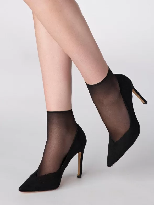 Тонкие женские носки из полиамида. Они идеально облегают ноги за счет добавления эластана и не вызывают усталости даже при длительном ношении, поскольку давление распределено по всей площади, что позволило сделать резинку максимально тонкой.