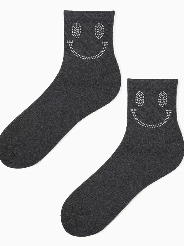 Круглогодичные средней длины женские носки, цвет темно-серый, повседневные, необычные, с украшениями, принт (рисунок): с узором, поп-культура, состав: 75% хлопок, 20% полиамид, 5% эластан, арт. SC SILVER SMILEY. Производитель «MARILYN» Польша под брендом «Marilyn».