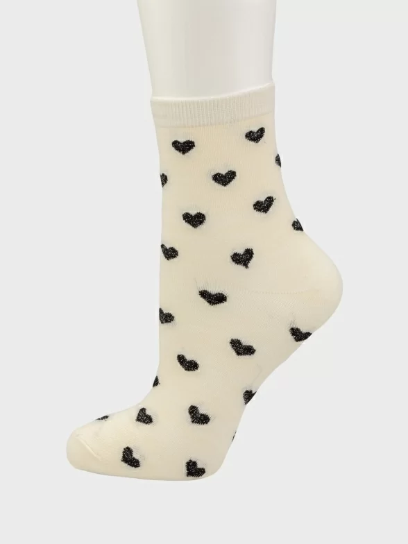 Круглогодичные укороченные женские носки, цвет бежевый, классические, шов обычный (не бесшовные), принт (рисунок): сердечки / поцелуи / любовь, состав: 97% хлопок, 2% полиамид, 1% лайкра, арт. PW681. Производитель «Oemen» Китай под брендом «Oemen».