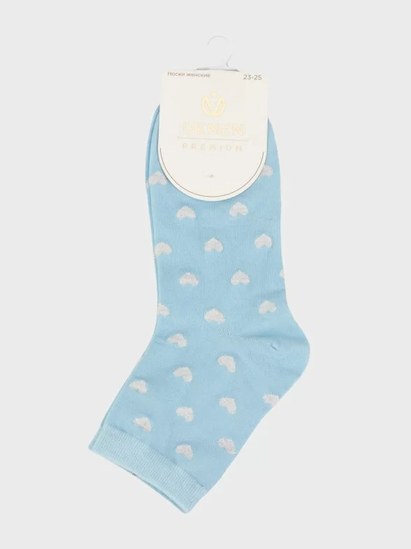 Круглогодичные укороченные женские носки, цвет голубой, классические, шов обычный (не бесшовные), принт (рисунок): сердечки / поцелуи / любовь, состав: 97% хлопок, 2% полиамид, 1% лайкра, арт. PW681. Производитель «Oemen» Китай под брендом «Oemen».