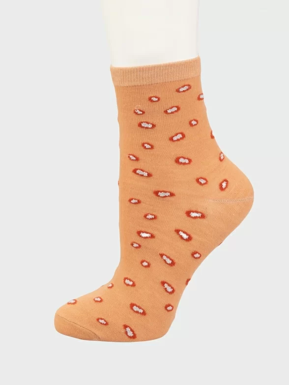 Круглогодичные укороченные женские носки, цвет оранжевый, классические, шов обычный (не бесшовные), принт (рисунок): горох / точка, состав: 97% хлопок, 2% полиамид, 1% лайкра, арт. PW682. Производитель «Oemen» Китай под брендом «Oemen».