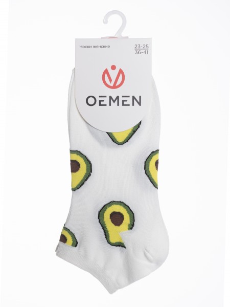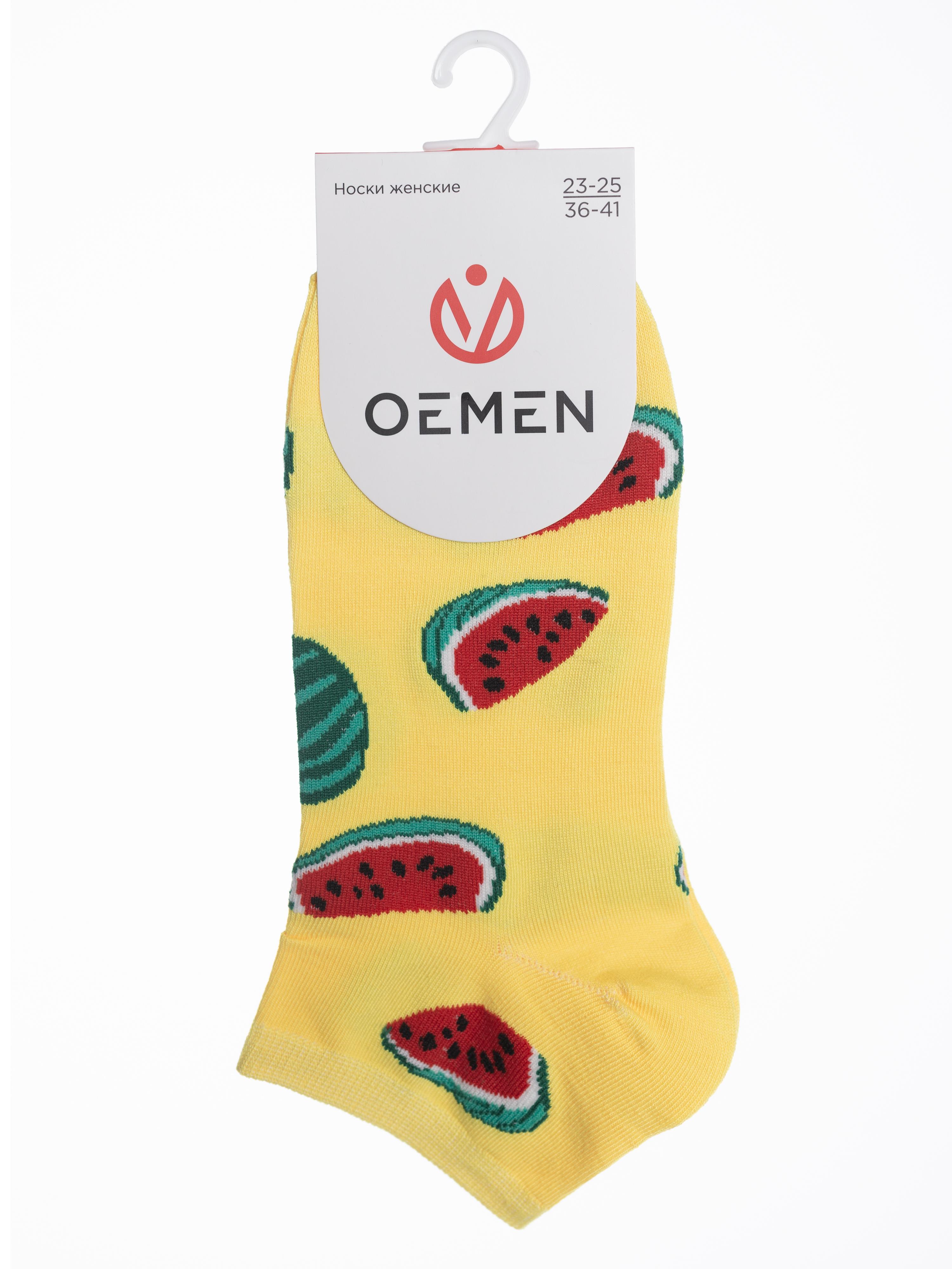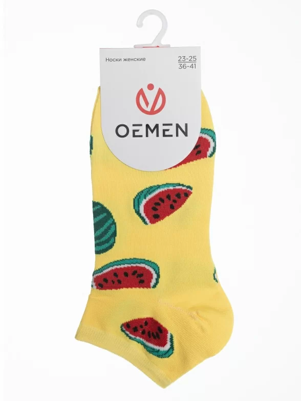 Летние короткие женские носки, цвет желтый, классические, шов обычный (не бесшовные), принт (рисунок): фрукты, ягоды, арбуз, состав: 80% хлопок, 17% полиамид, 3% лайкра, арт. PW175. Производитель «Oemen» Китай под брендом «Oemen».