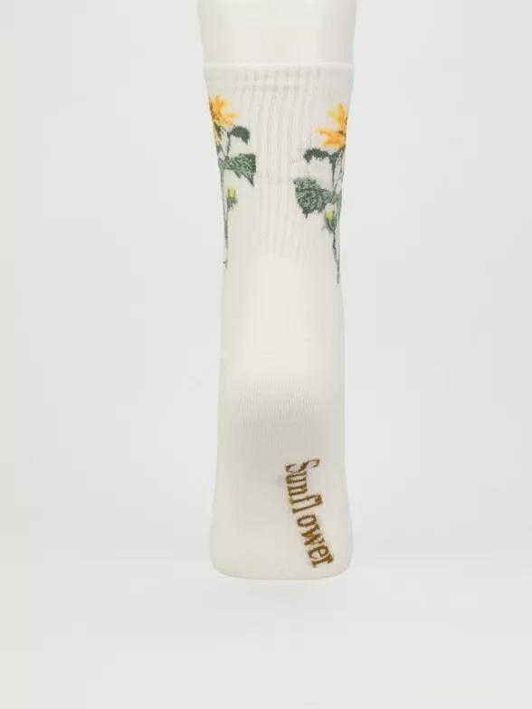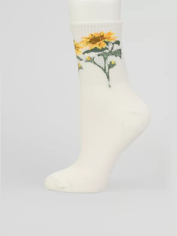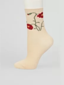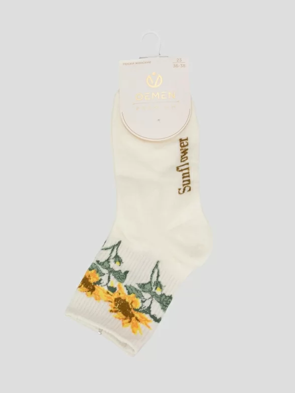 Круглогодичные укороченные женские носки, цвет бежевый, спортивные, шов обычный (не бесшовные), принт (рисунок): цветы / растения, состав: 97% хлопок, 2% полиамид, 1% лайкра, арт. PW591. Производитель «Oemen» Китай под брендом «Oemen».