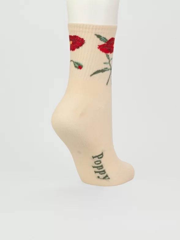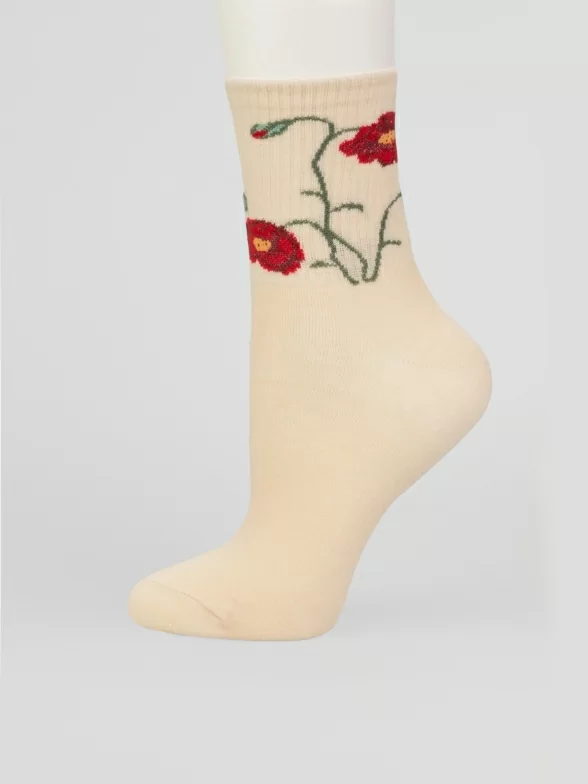 Круглогодичные укороченные женские носки, цвет желтый, спортивные, шов обычный (не бесшовные), принт (рисунок): цветы / растения, состав: 97% хлопок, 2% полиамид, 1% лайкра, арт. PW594. Производитель «Oemen» Китай под брендом «Oemen».