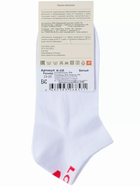 Пара белых носков артикула Ж-235 поставляется с фабричной этикеткой в обычном или курьер-пакете.