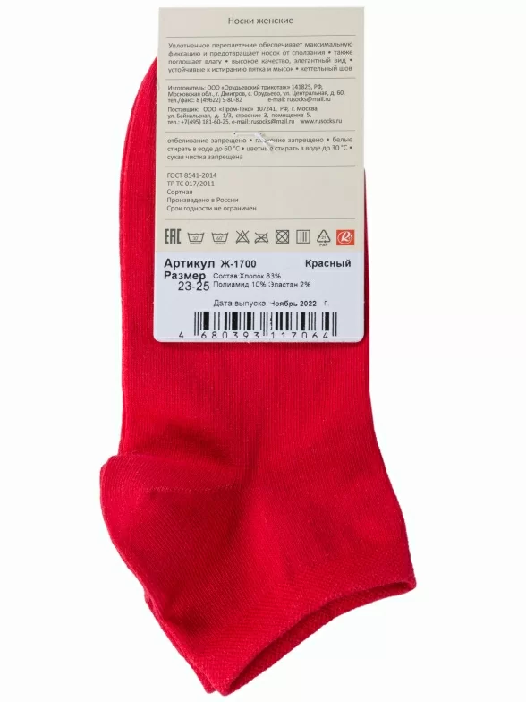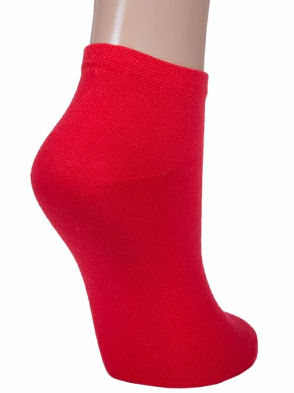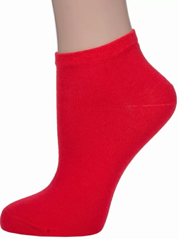 Круглогодичные или летние короткие женские носки, цвет красный, спортивные, классические, шов кеттельный (бесшовная технология), принт (рисунок): однотонный, без рисунков/узоров, состав: 88% хлопок, 10% полиамид, 2% эластан, арт. Ж-1700. Производитель «ООО Орудьевский трикотаж, Россия» под брендом «Rusocks (орудьевский трикотаж)».