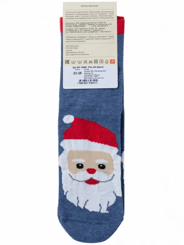 Круглогодичные средней длины женские носки, цвет синий-джинс, повседневные, шов кеттельный (бесшовная технология), принт (рисунок): новый год, с узором, крупные контрастные рисунки, состав: 78% хлопок, 20% полиамид, 2% эластан, арт. Ж3-13849. Производитель «ООО Орудьевский трикотаж, Россия» под брендом «Rusocks (орудьевский трикотаж)».
