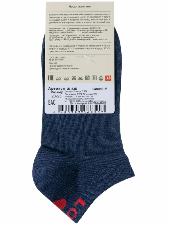 Пара синих носков артикула Ж-235 поставляется с фабричной этикеткой в обычном или курьер-пакете.