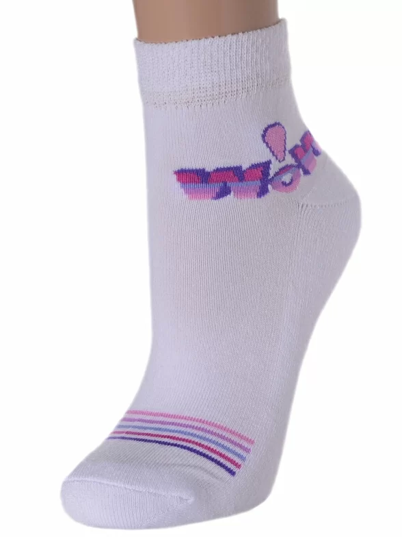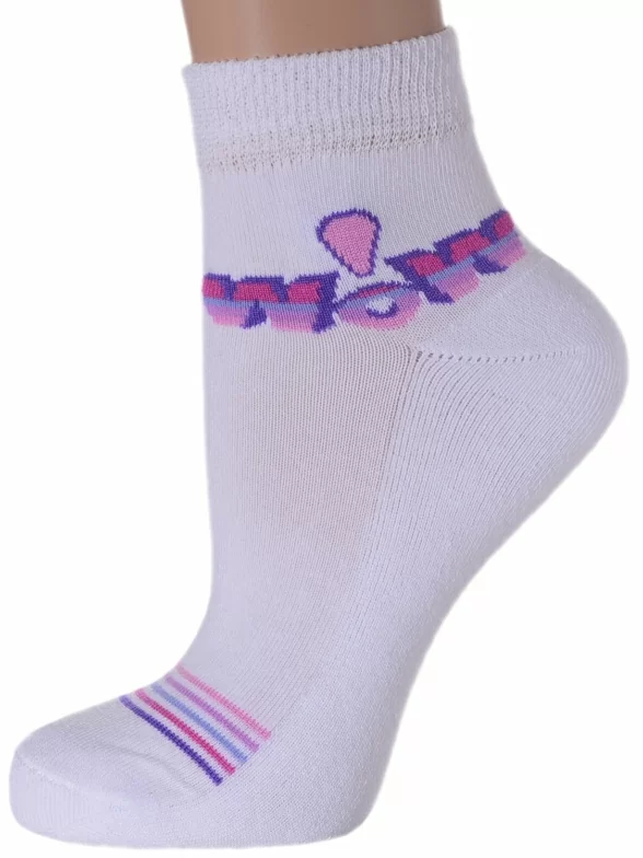 Плотные женские носки с махровым следом. Они оформлены яркими контрастными полосками и вызывающей надписью. Носки хорошо тянутся, отличаются высоким содержанием натурального хлопка и удобной резинкой.