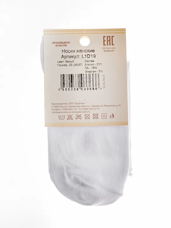 Круглогодичные укороченные женские носки, цвет белый, медицинские, классические, шов обычный (не бесшовные), принт (рисунок): однотонный, без рисунков/узоров, состав: 83% хлопок, 15% полиамид, 2% эластан, арт. L1D19. Производитель «ПРОМЭКС ООО, Смоленская область, Россия» под брендом «Para socks».