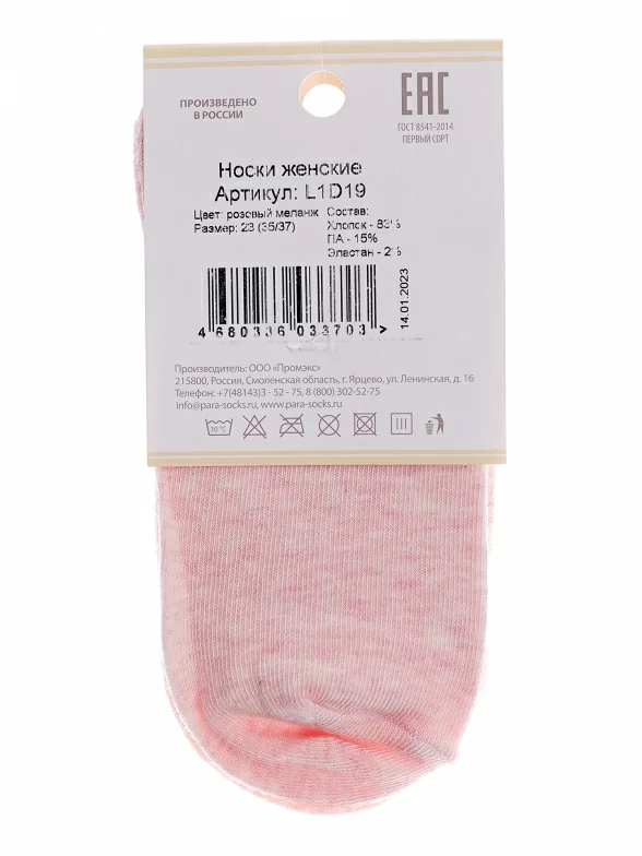 Круглогодичные укороченные женские носки, цвет розовый, медицинские, классические, шов обычный (не бесшовные), принт (рисунок): однотонный, без рисунков/узоров, состав: 83% хлопок, 15% полиамид, 2% эластан, арт. L1D19. Производитель «ПРОМЭКС ООО, Смоленская область, Россия» под брендом «Para socks».