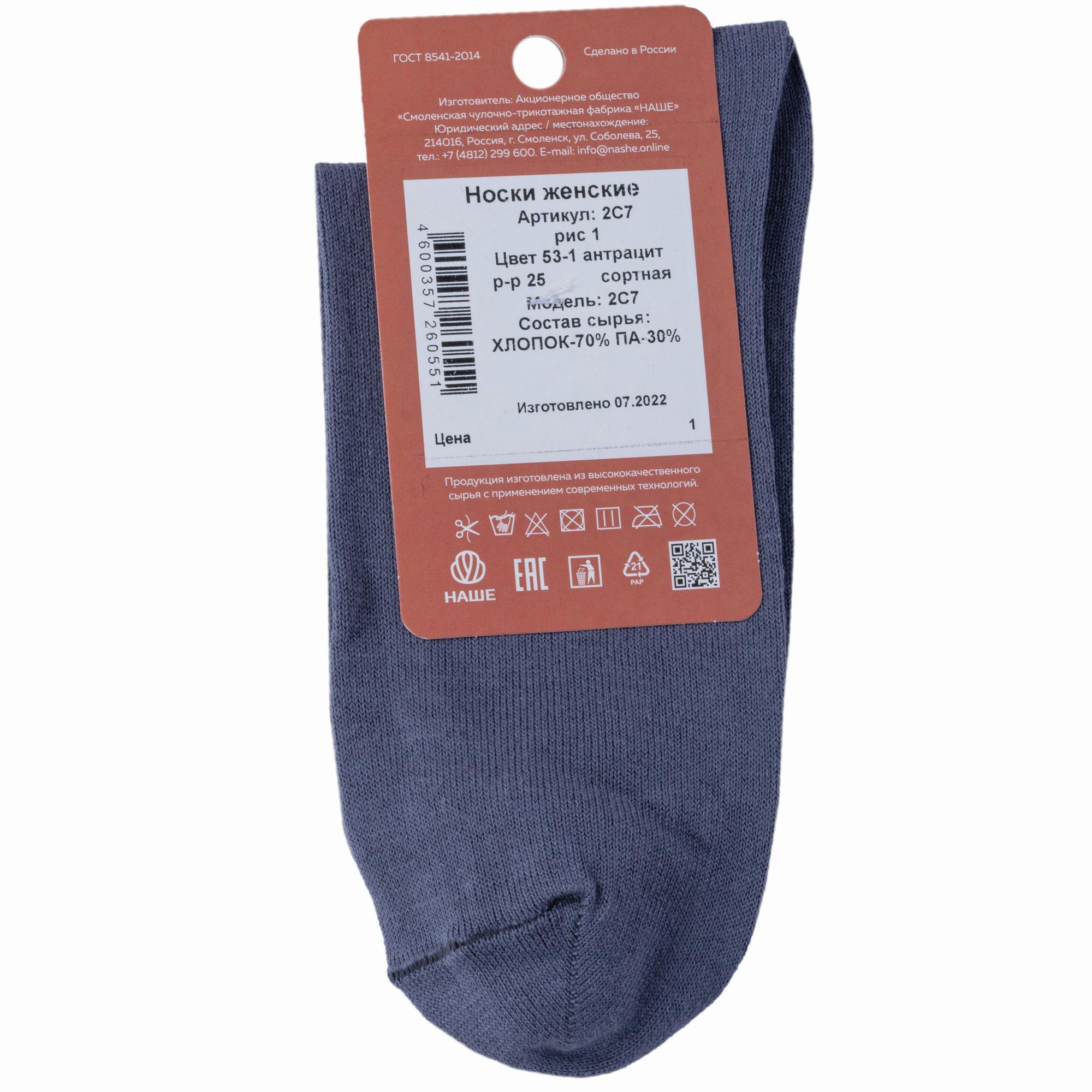 Круглогодичные укороченные женские носки, цвет серый, классические, шов обычный (не бесшовные), принт (рисунок): однотонный, без рисунков/узоров, состав: 70% хлопок, 30% полиамид, арт. 2С7. Производитель «Смоленская чулочная фабрика, Россия» под брендом «Наше смоленской чулочной фабрики».