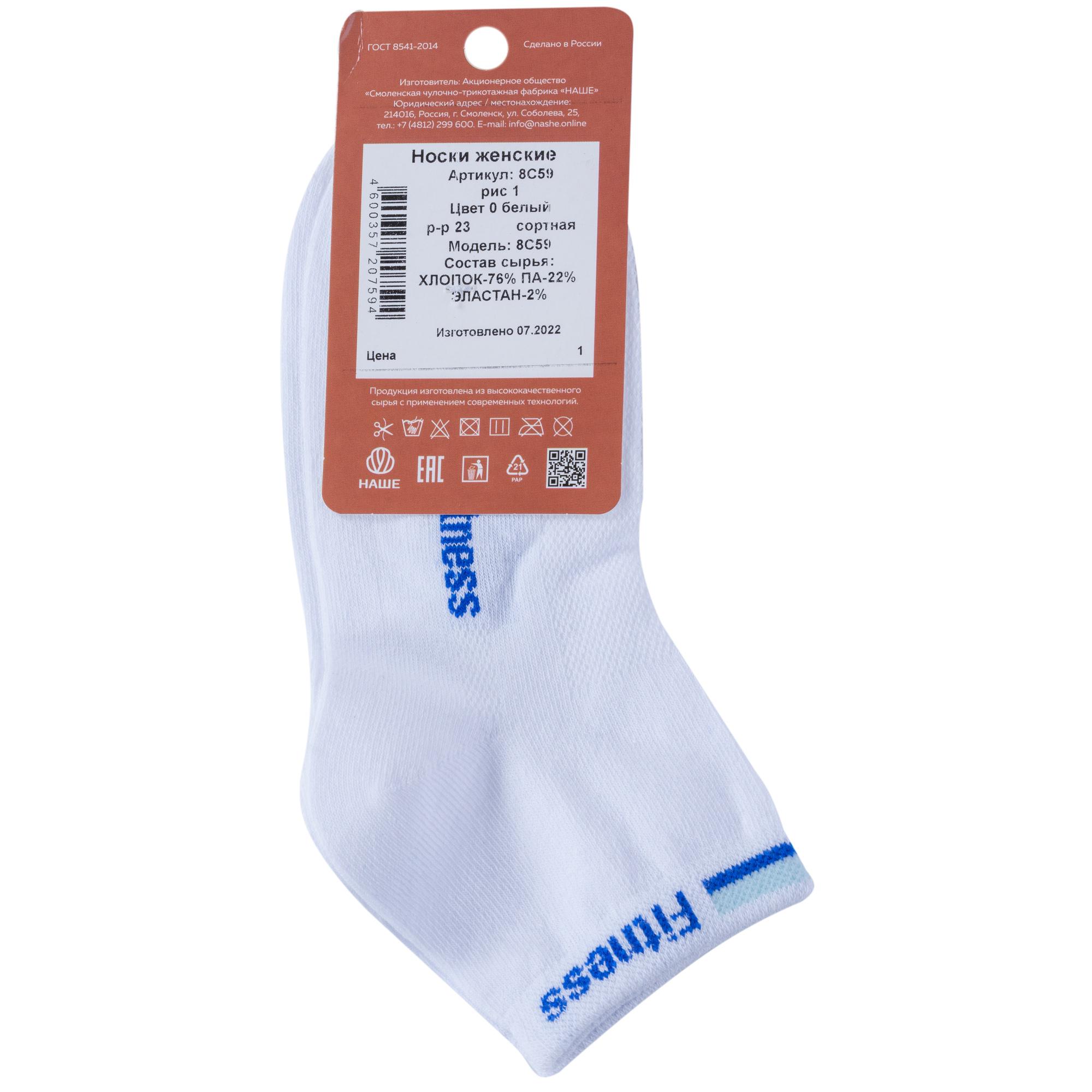 Летние короткие женские носки, цвет белый, в сеточку, спортивные, шов обычный (не бесшовные), принт (рисунок): спортивные, с узором, состав: 76% хлопок, 22% полиамид, 2% эластан, арт. 8С59. Производитель «Смоленская чулочная фабрика, Россия» под брендом «Наше смоленской чулочной фабрики».