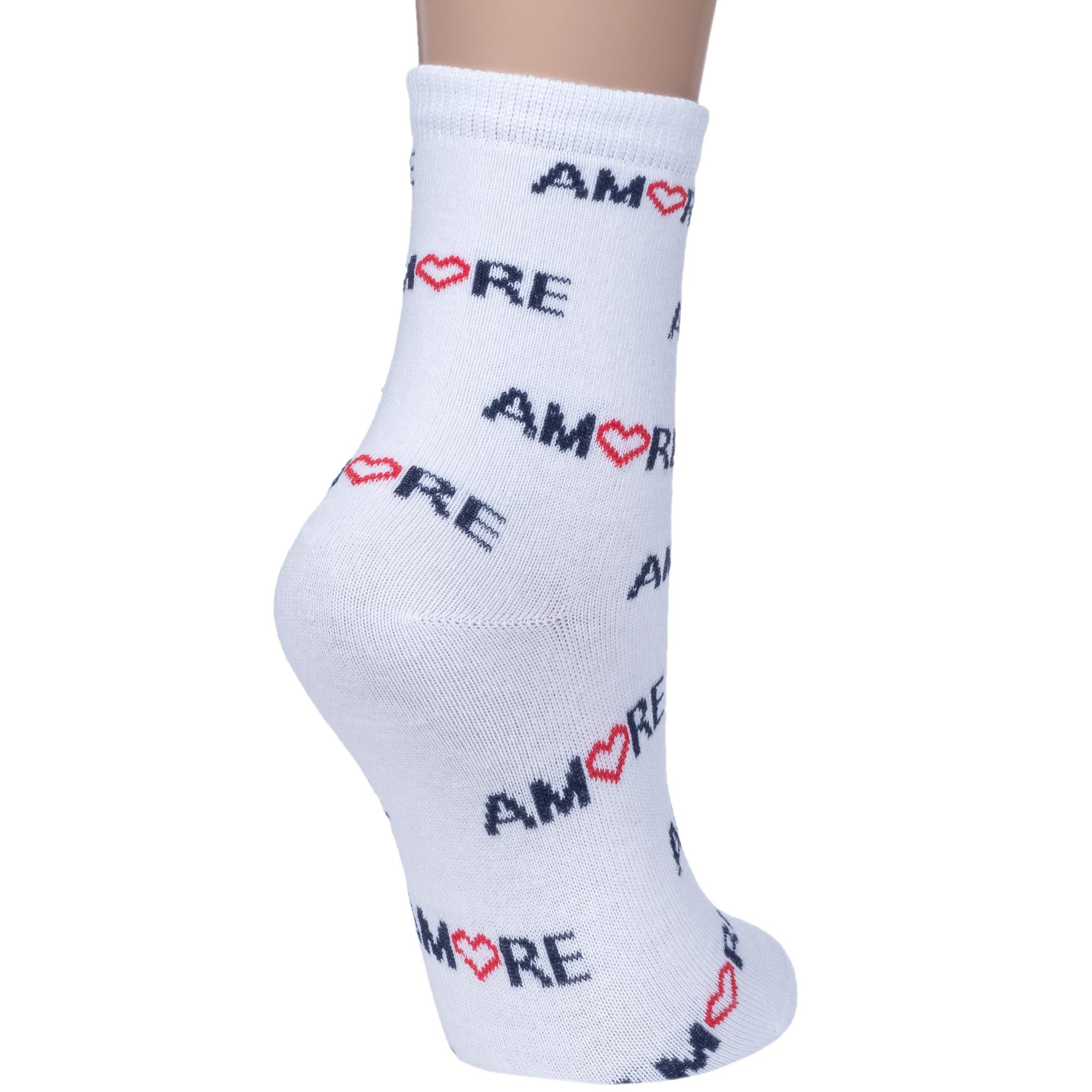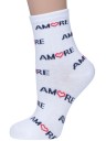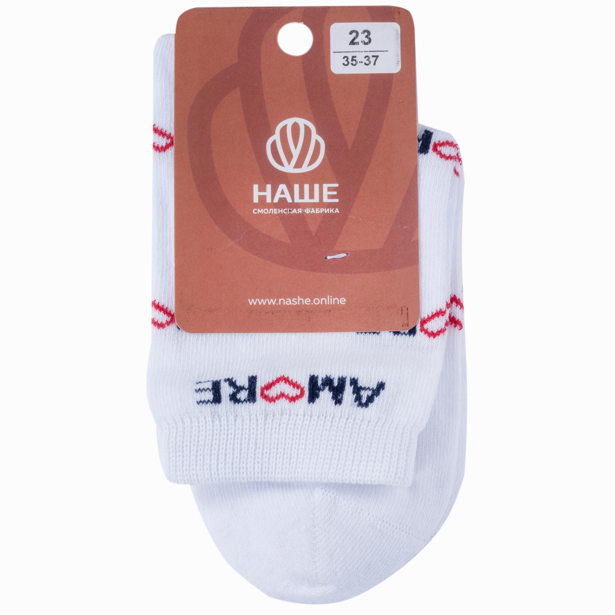 Круглогодичные укороченные женские носки, цвет белый, повседневные, шов обычный (не бесшовные), принт (рисунок): сердечки / поцелуи / любовь, надписи, с узором, состав: 72% хлопок, 20% полиамид, 6% полипропилен, 2% эластан, арт. 422С17. Производитель «Смоленская чулочная фабрика, Россия» под брендом «Наше смоленской чулочной фабрики».