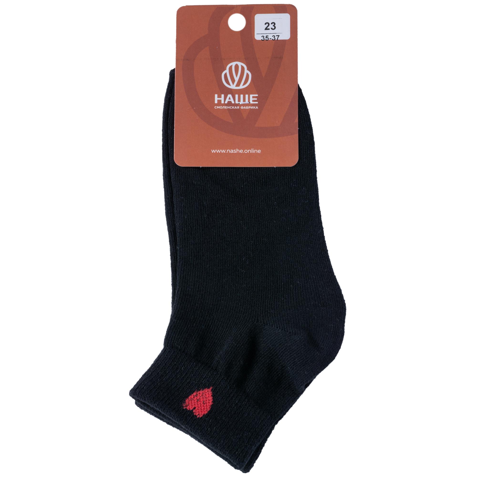 Круглогодичные короткие женские носки, цвет черный, повседневные, шов обычный (не бесшовные), принт (рисунок): сердечки / поцелуи / любовь, однотонный, небольшой рисунок, состав: 75% хлопок, 23% полиамид, 2% эластан, арт. 422С40. Производитель «Смоленская чулочная фабрика, Россия» под брендом «Наше смоленской чулочной фабрики».