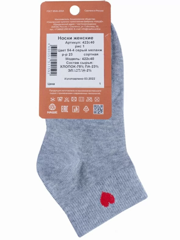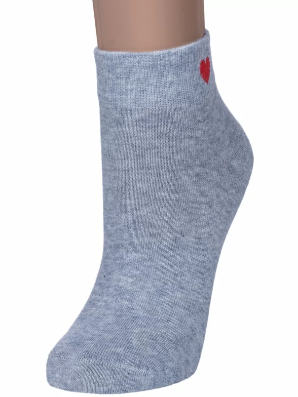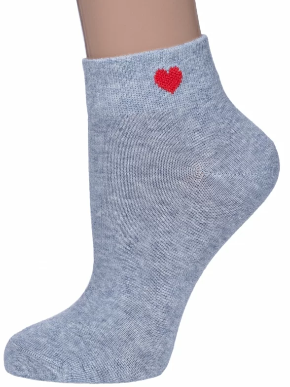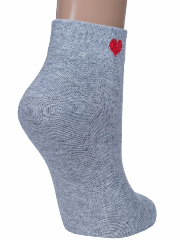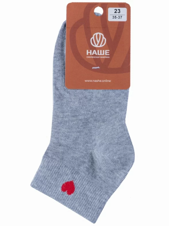 Круглогодичные короткие женские носки, цвет светло-серый, повседневные, шов обычный (не бесшовные), принт (рисунок): сердечки / поцелуи / любовь, однотонный, небольшой рисунок, состав: 75% хлопок, 23% полиамид, 2% эластан, арт. 422С40. Производитель «Смоленская чулочная фабрика, Россия» под брендом «Наше смоленской чулочной фабрики».