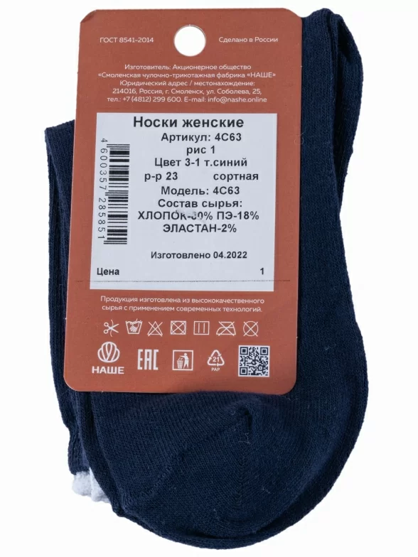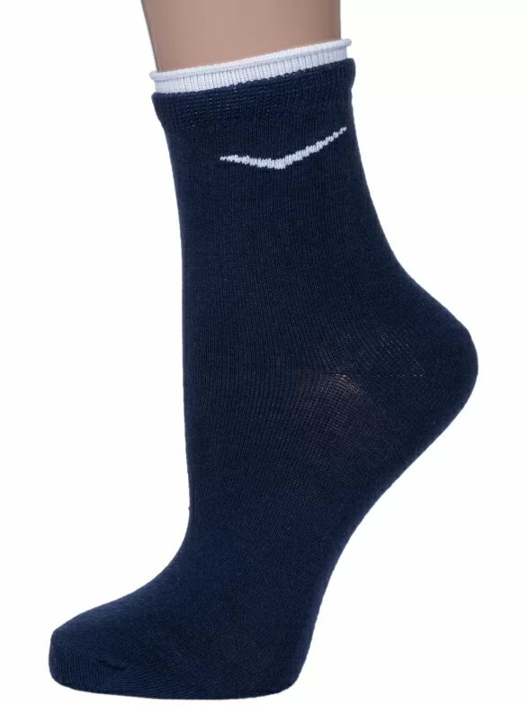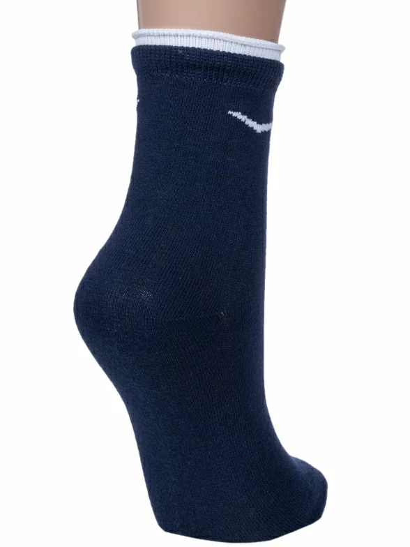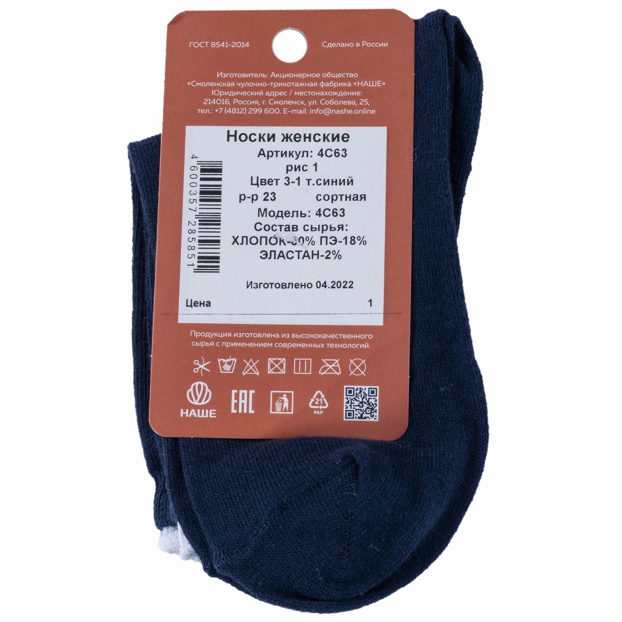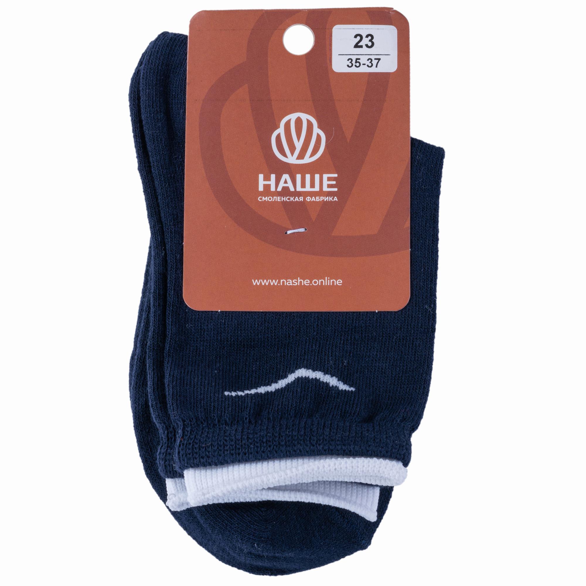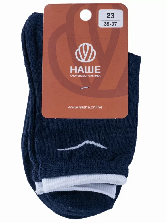 Круглогодичные укороченные женские носки, цвет темно-синий, спортивные, шов обычный (не бесшовные), принт (рисунок): небольшой рисунок, спортивные, с узором, однотонный, состав: 80% хлопок, 18% полиэстер, 2% эластан, арт. 4С63. Производитель «Смоленская чулочная фабрика, Россия» под брендом «Наше смоленской чулочной фабрики».