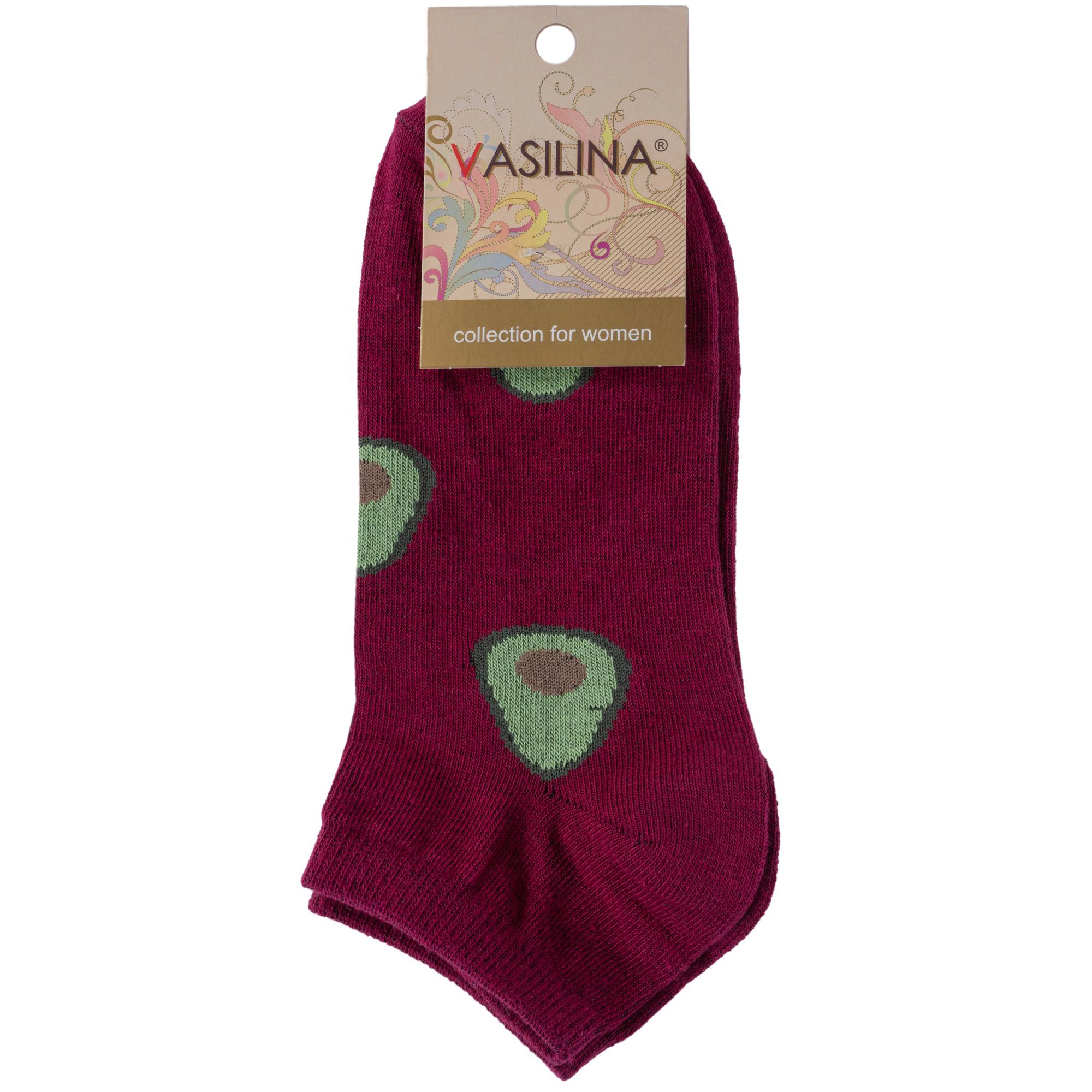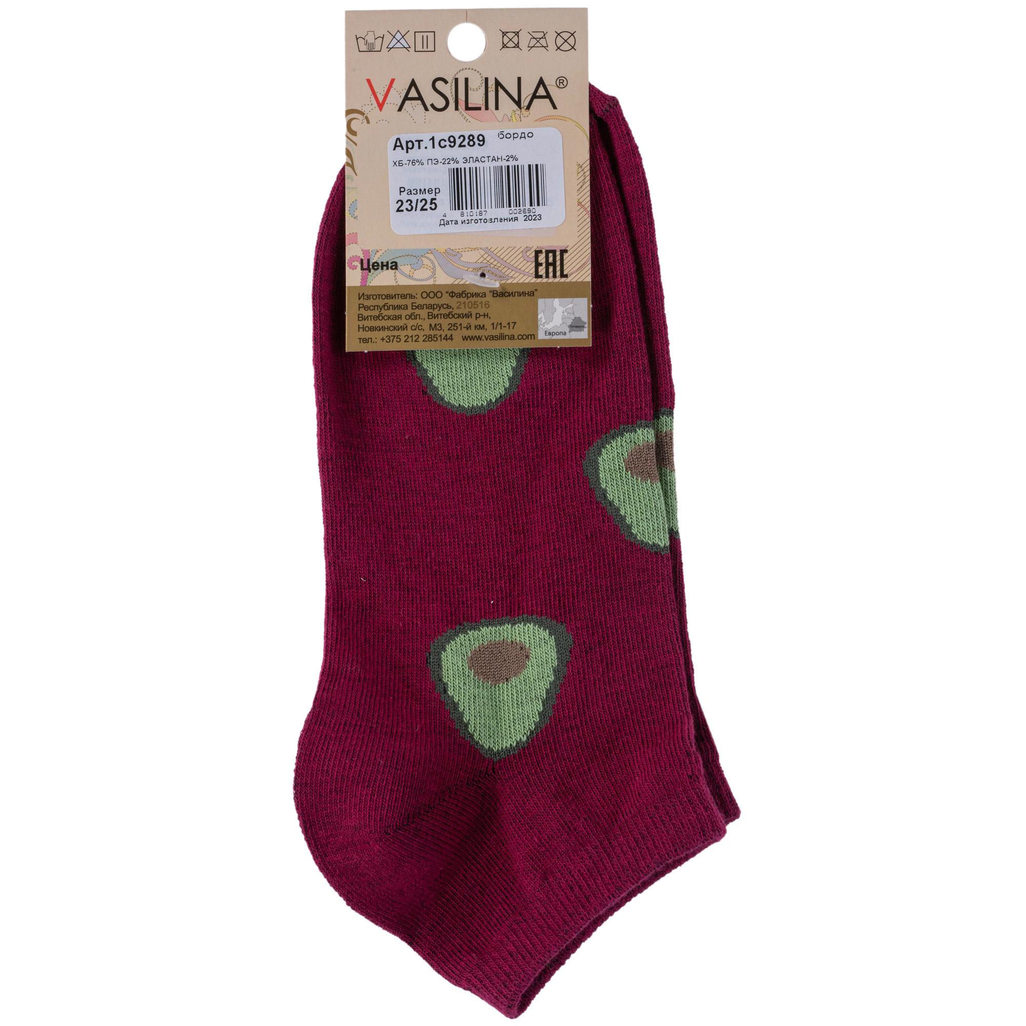 Круглогодичные короткие женские носки, цвет бордовый, повседневные, шов обычный (не бесшовные), принт (рисунок): овощи / фрукты / ягоды, еда и напитки, с узором, состав: 76% хлопок, 22% полиэстер, 2% эластан, арт. 1С9289. Производитель «ООО Фабрика Василина, Беларусь» под брендом «Vasilina».